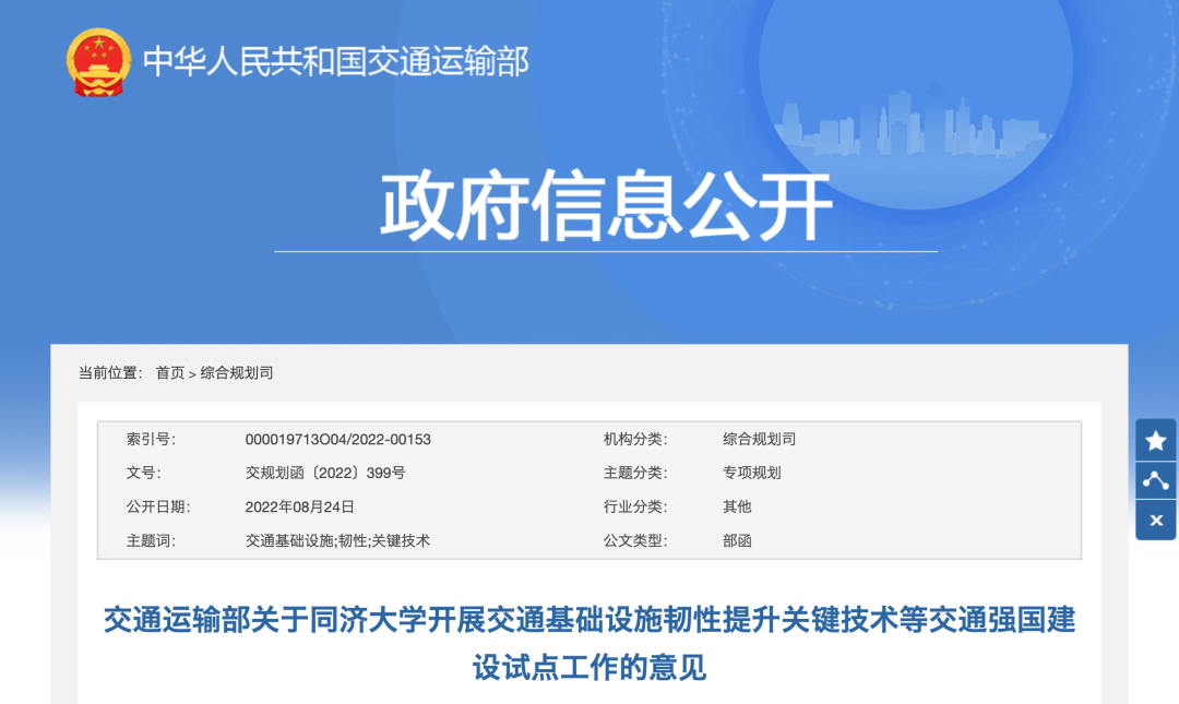 - 交通运输部批复意见《交通运输部关于yl8cc永利开展交通基础设施韧性提升关键技术等交通强国建设试点工作的意见》中指出:原则同意在交通基础设施韧性提升关键技术、综合交通低碳化发展关键技术、道路交通系统本质安全保障关键技术、一体化出行服务与治理关键技术、综合交通枢纽建设及智慧运营关键技术、高速磁浮交通装备集成验证和综合评估平台建设、智能车路协同系统创新人才培养等方面开展试点。请统筹推进各项试点任务,抓紧...