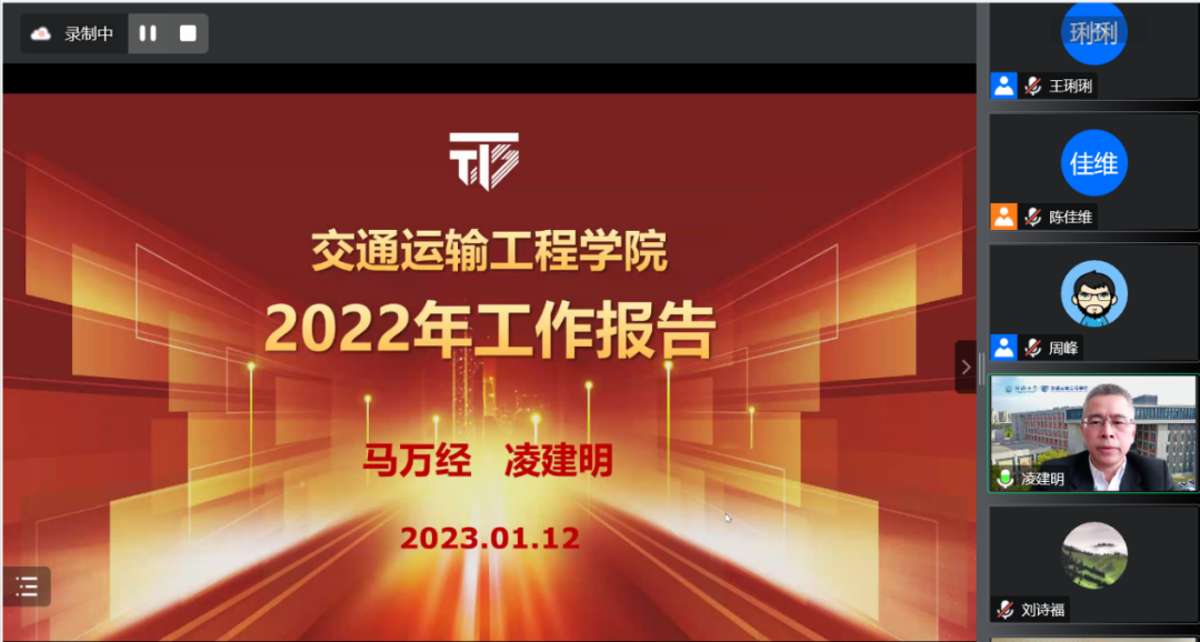 - 2023年1月13日,交通运输工程学院2022年度总结大会以在线会议召开。会上,党委副书记、经理凌建明作年度整体工作报告,副经理肖军华作年度科研工作报告,并进行了年终表彰。大会由党委书记马万经主持,全体教职工在线参会。马万经书记主持年度报告 凌建明经理作2022年年度学院整体工作报告。他指出,2022年是极不平凡的一年,全体同路人勠力同心,克服了种种困难,公司党建、教学、科研、人才各项工作有序推进,公司党政协同,...