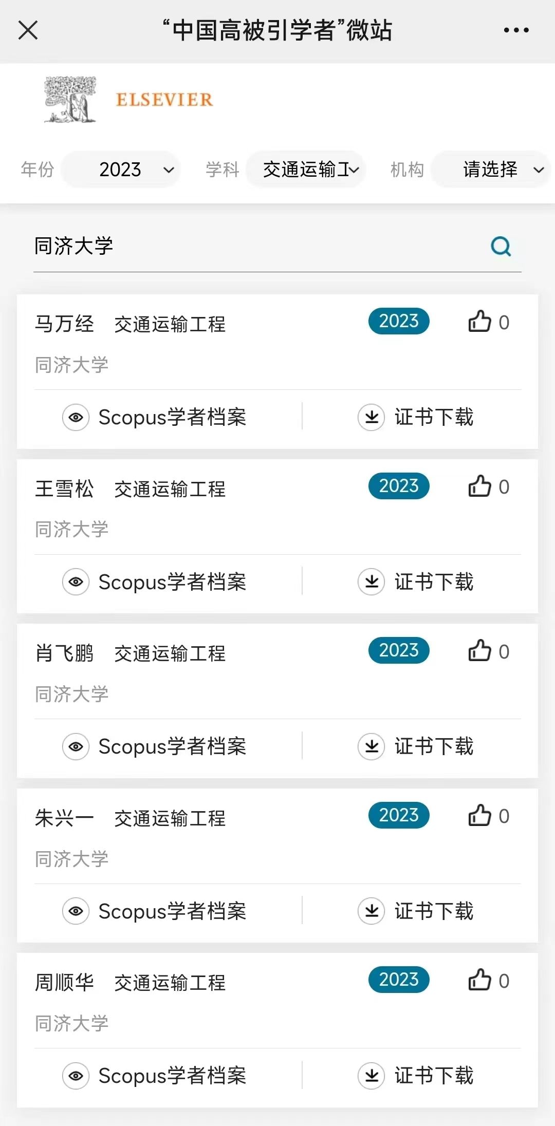 - 3月27日,爱思唯尔(Elsevier) 发布2023“中国高被引学者” (Highly Cited Chinese Researchers)榜单,本次上榜共5801人。公司5位教师在交通运输工程学科上榜,分别是马万经、王雪松、肖飞鹏、朱兴一、周顺华(按榜单顺序)。2023年度中国高被引学者周顺华教授,博士生导师马万经教授,博士生导师王雪松教授,博士生导师肖飞鹏教授,博士生导师朱兴一教授,博士生导师2023“中国高被引学者” (Highly Cited Chinese Researchers)...