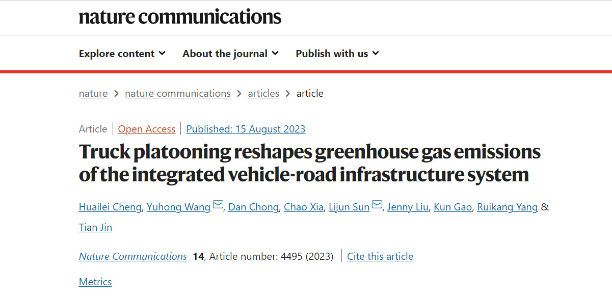 8月15日,yl8cc永利交通运输工程学院孙立军教授团队与香港理工大学、密苏里科技大学、查尔姆斯大学等高校学者合作完成的研究论文“Truck platooning reshapes greenhouse gas emissions of the integrated vehicle-road infrastructure system”发表于《自然·通讯》(Nature Communications)杂志。文章通讯作者为公司孙立军教授与香港理工大学王予红教授,第一作者为两校联合培养的双学位博士程怀磊。