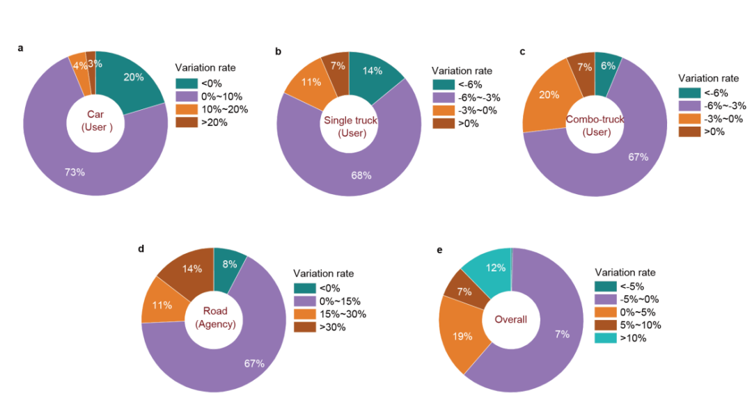 研究结果表明,编队技术可降低卡车排放6.9%,但将加速路面损伤与养护维修,导致路面运维排放增加27.9%;两者相抵后的总排放将减少5.1%,相当于每公里减少76吨二氧化碳当量(CO2-eq)。同时,车-路系统的养护维修及拥堵成本增加4.6%,对卡车用户、小汽车用户和路面养护机构带来不同的成本压力。因此,需要新的政策引导,以平衡卡车编队对各方排放与成本的影响;也需要提出新的路面结构、材料设计方法,降低编队技术对路面设施耐久性的影响。研究成果可为可持续绿色交通政策的制定以及新型长寿命路面设计提供依据。