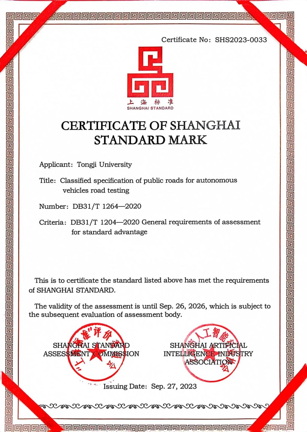 2023年10月14日,为庆祝第54届世界标准日,“上海市2023年‘世界标准日’主题活动”在浦东张江科学会堂举行。主题活动上发布了2023年“上海标准”名单。由公司孙立军教授、涂辉招教授主持编制的上海市地方标准《自动驾驶开放测试道路环境分级规范》(DB31/T 1264-2020)入选“上海标准”。