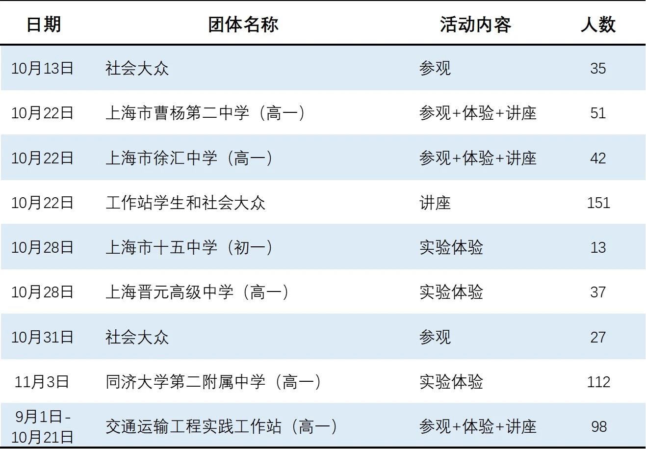 每年的5月和10月,公司都会开展交通科技节&科普开放日活动,邀请中小员工和社会大众走进同济校园,开展实验室探秘、科学知识讲座等参观研学活动。本次同济交通科普开放活动,同学们不仅在实验中体验到科学实践的乐趣、学习了交通专业的知识,还提前感受到大学校园的氛围、了解了大学课程的内容,获得充实且快乐的研学体验。