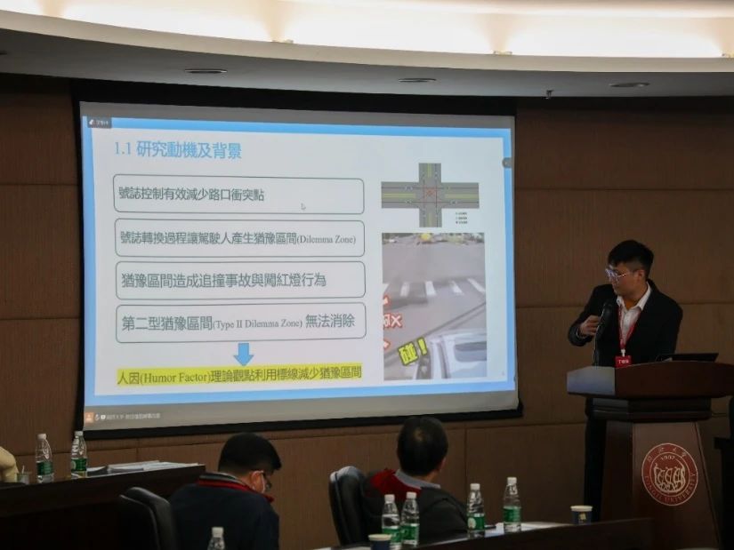 逢甲大学在读硕士研究生丁冠杰同学就“以路面标线减少驾驶人犹豫区间之研究”主题展开报告。
