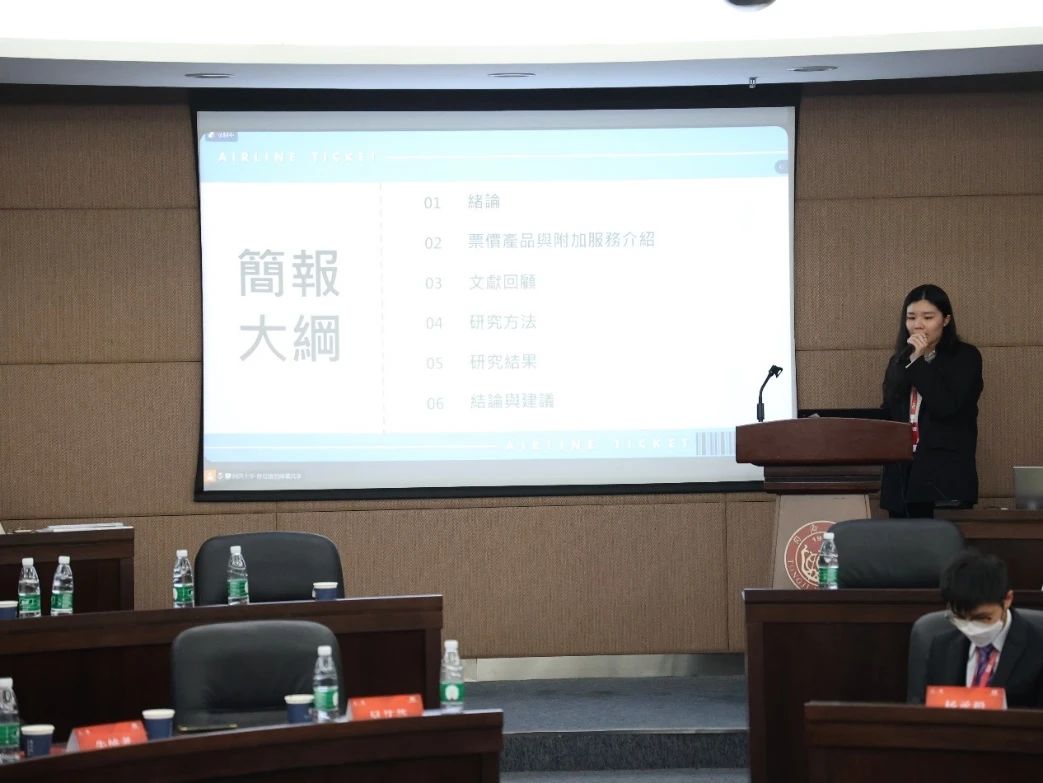 逢甲大学在读硕士研究生吴凯雯同学就“低成本航空票价产品与附加服务之旅客选择偏好”主题展开报告。