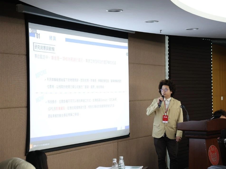 逢甲大学车辆行车事故鉴定研究中心助理陈孟谦就“不同推估法计算碰撞车速之差异性分析”主题展开报告。