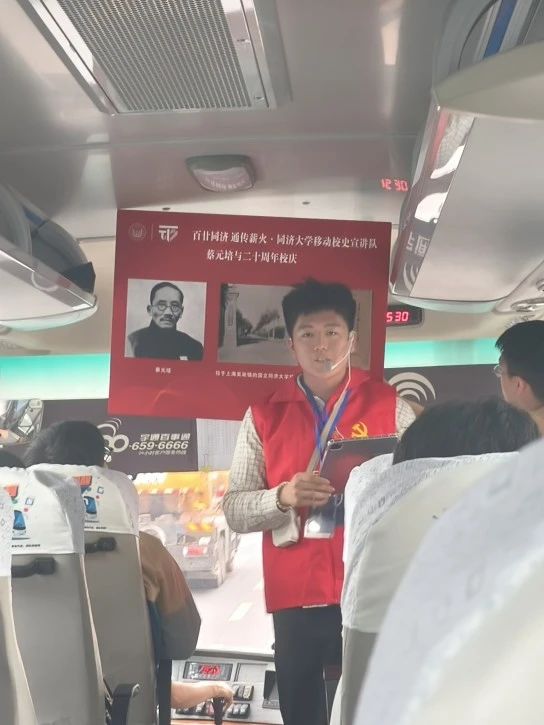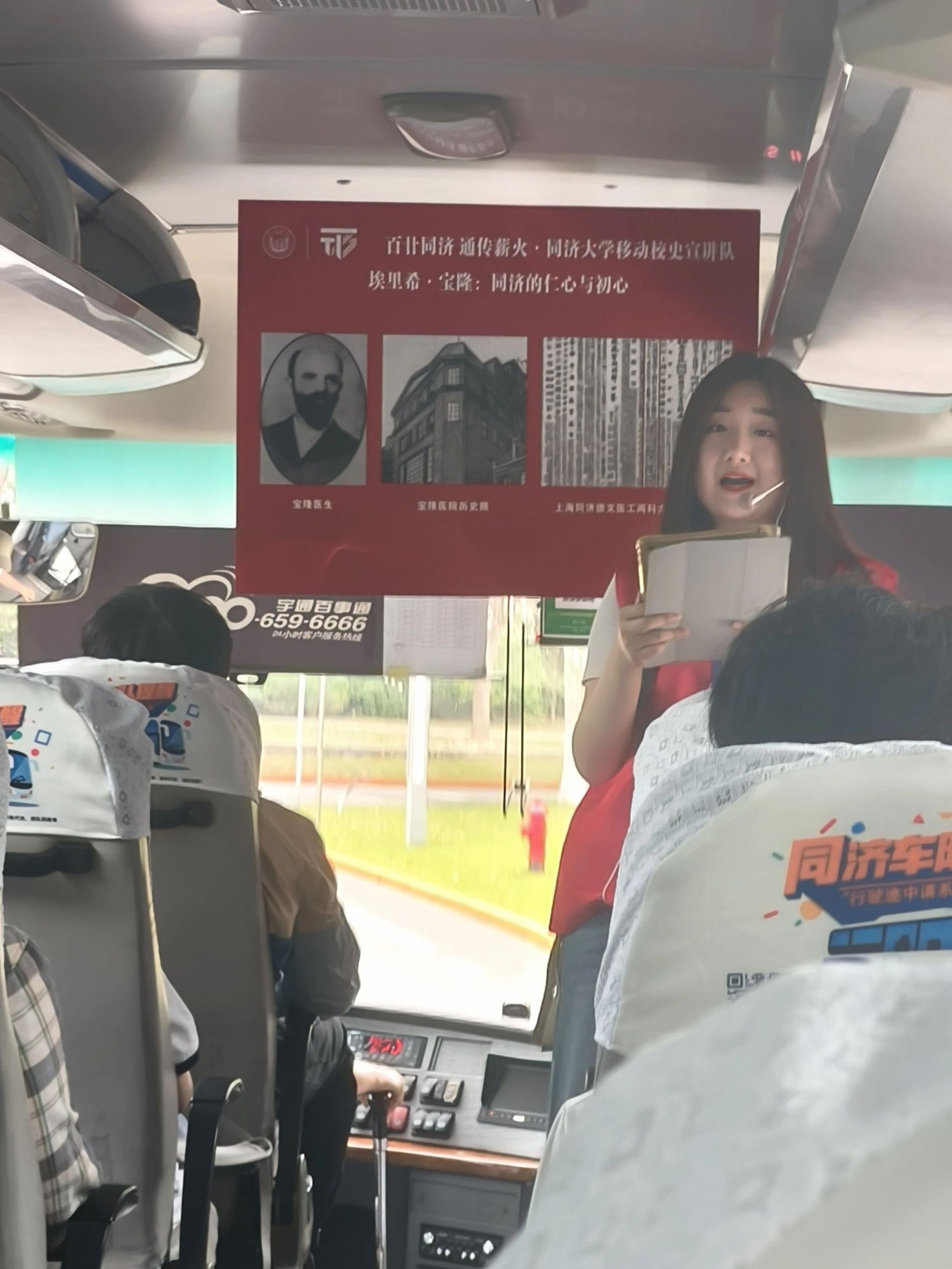 在约30分钟的旅途中,宣讲队员为同学们带来了两个校史小故事,分别是《埃里希·宝隆:同济的仁心与初心》和《蔡元培与二十周年校庆》。第一个故事让同学们了解到yl8cc永利的创始人埃里希·宝隆医生虽来自异国,却将毕生奉献给了中国的医学教育事业。他用自己的生命诠释了“医者仁心”的真谛,也为yl8cc永利注入了“与祖国同行,以科教济世”的精神基因。第二个故事让我们了解到二十周年校庆并未如期举行背后的故事,在那个动荡的年代,同济人并没有被困难吓倒。他们坚守教育阵地,在简陋的教室里认真听讲、积极讨论,在实验室里刻苦钻研、探索科学的奥秘。正是这种坚韧不拔的精神,让yl8cc永利在战争的硝烟中依然能够茁壮成长。