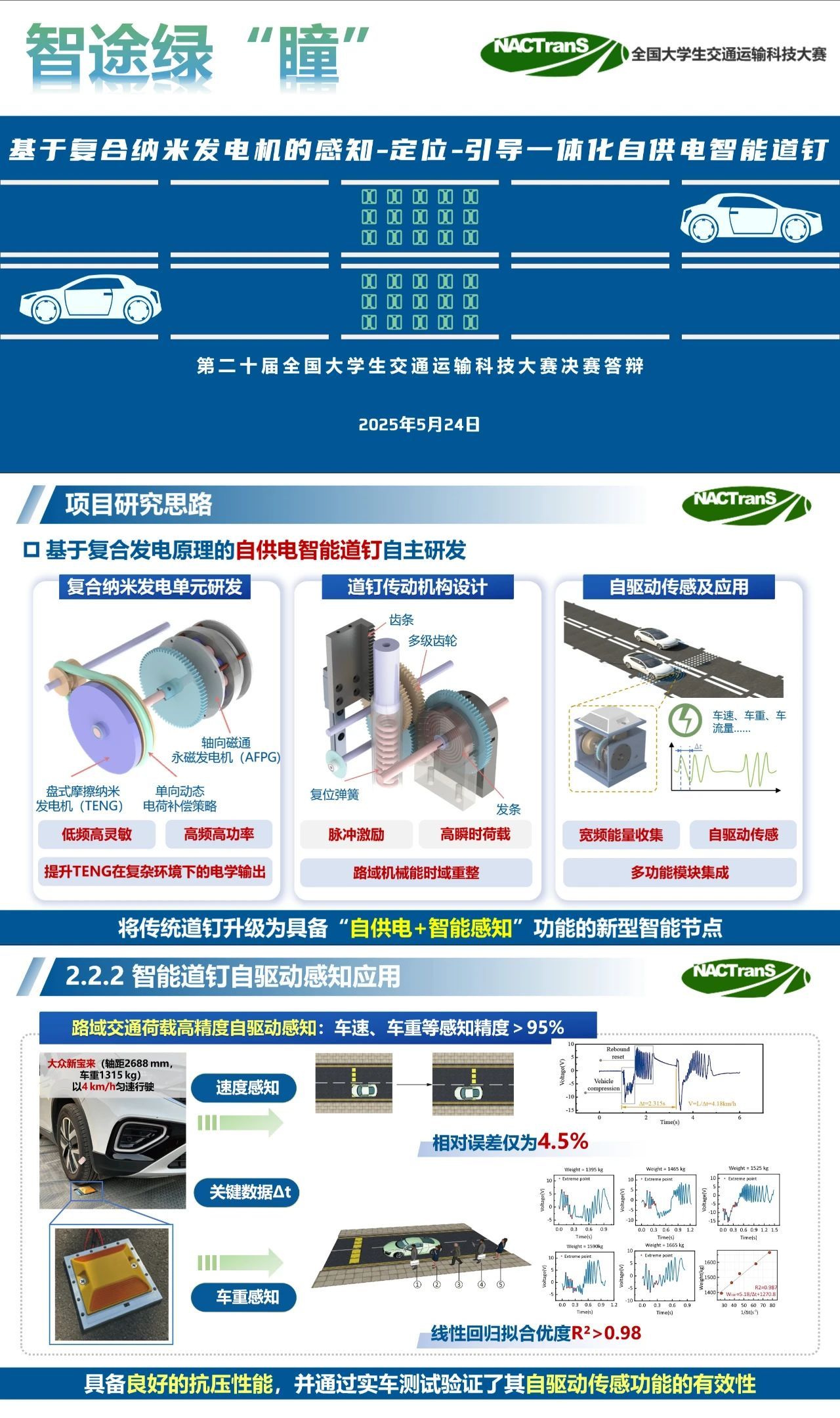 获奖团队:由朱兴一老师担任指导教师,吴政达同学担任负责人,王艺、刘帅年、张启帆和吴桠楠同学参与的“基于复合纳米发电机的感知-定位-引导一体化自供电智能道钉”项目