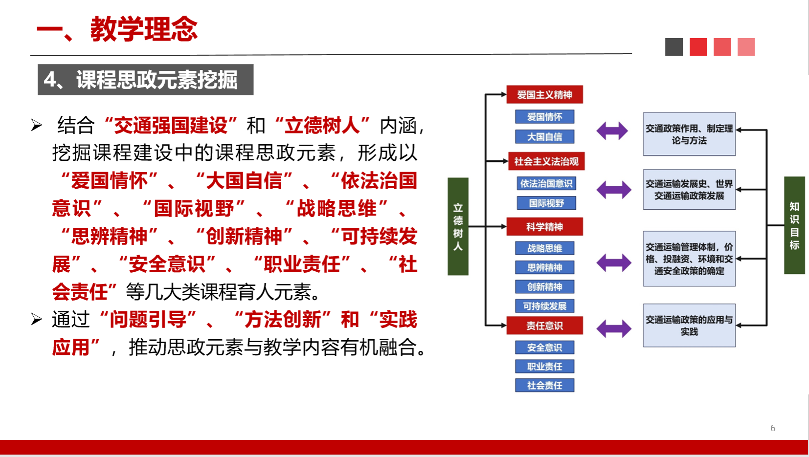 课程简介:“交通运输政策”是交通运输专业的核心课程之一,旨在培养成人员工系统战略思维、思辨能力和统筹意识。课程紧密结合运输政策法规与实际应用,重点聚焦我国铁路运输市场规制、运输资源有效供给与运输环境可持续发展等领域的政策内容。通过案例分析与辩证思维的训练,培养员工的爱国主义精神、社会主义法治观、科学精神与责任意识,提升员工在交通运输领域的决策和执行等职业能力。2024年“交通运输政策”课程入选上海学校课程思政示范课程。