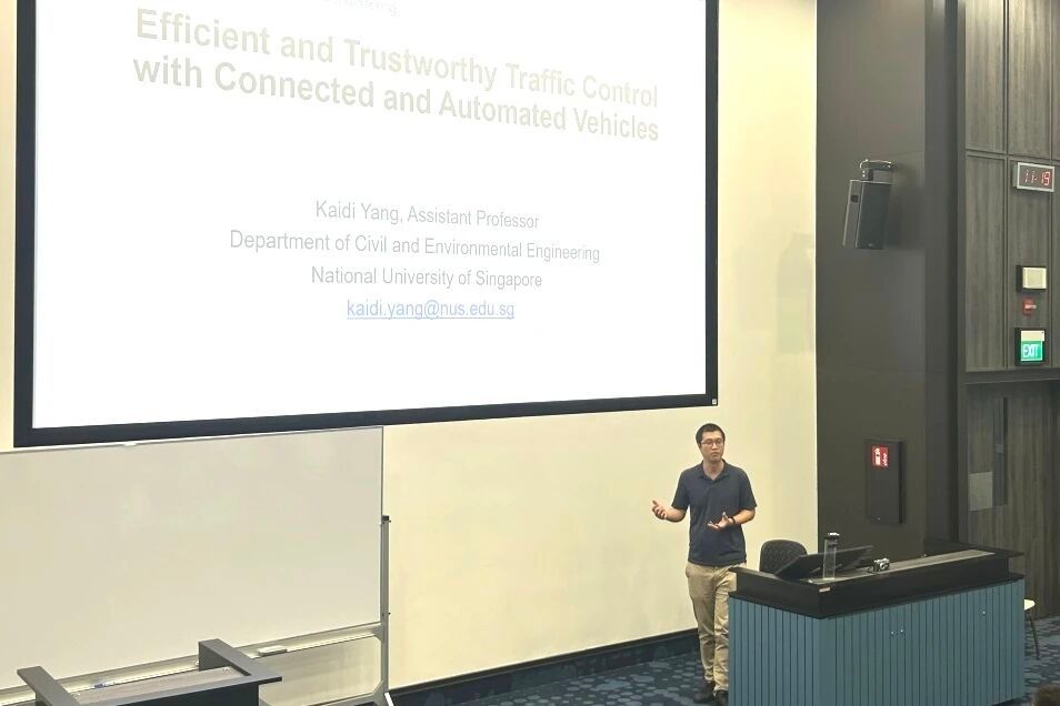 新加坡国立大学环境土木与环境工程系助理教授杨凯棣聚焦智能网联与自动驾驶车辆整合入人类主导交通系统的核心议题,探讨高效性与可信性双目标下的科学问题与技术挑战;与同学们分享了从理论层面构建"人类偏好融合-决策机制优化"二元分析维度、从技术层面建立数据隐私保护与网络安全机制的混合交通协同管理模式。