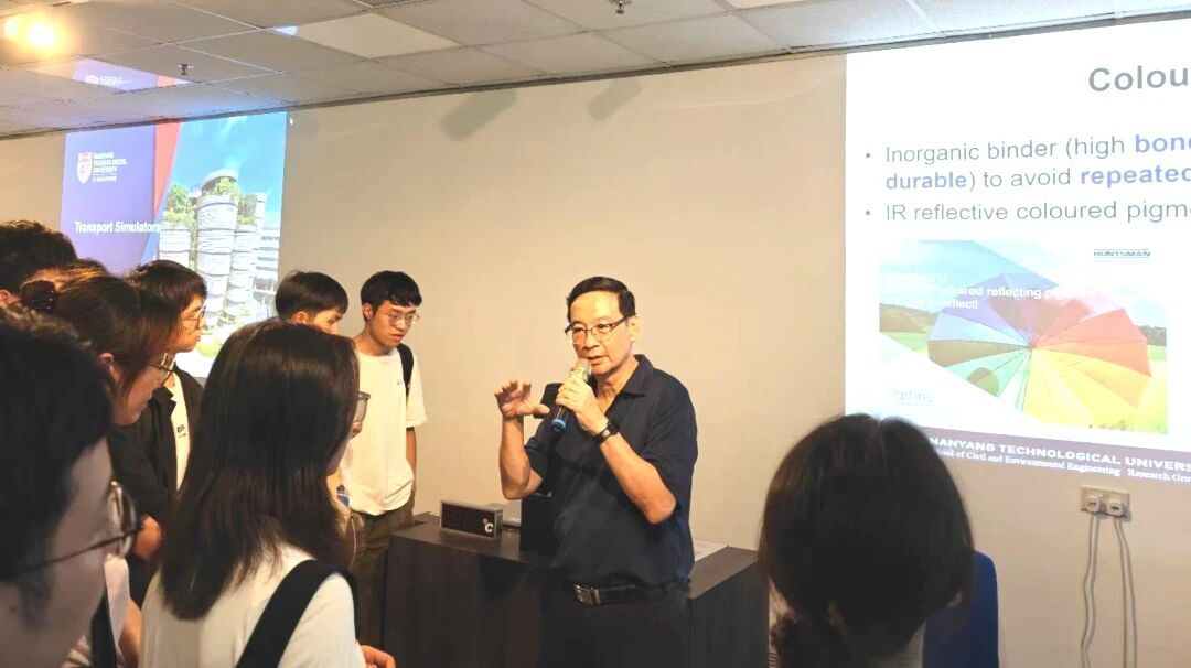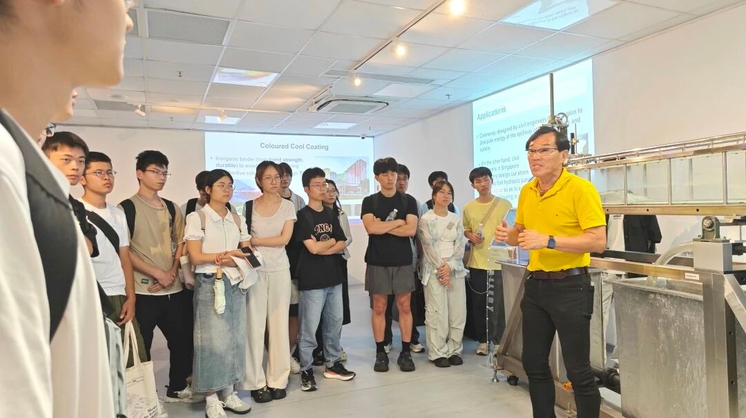 在南洋理工大学,大家先后走进交通和地理空间实验室,参观了内嵌无线感应充电系统的可弯曲混凝土路面展示原型,该技术通过转换器、发射线圈混凝土板及接收器完成电动汽车静态与动态充电,实现15cm内200-500W传输功率;观看了新加坡广泛使用的降温涂层展示,该技术通过添加高红外反射性能的复合无机颜料实现降温效果,在保证反射隔热性能的同时,满足建筑外观多样性需求,解决了“白色城市”的视觉单一性问题;了解了明渠水流中的水跃现象及工程师在溢洪道、雨水排水系统等不同需求工程场景下对水跃现象的应用或规避策略。