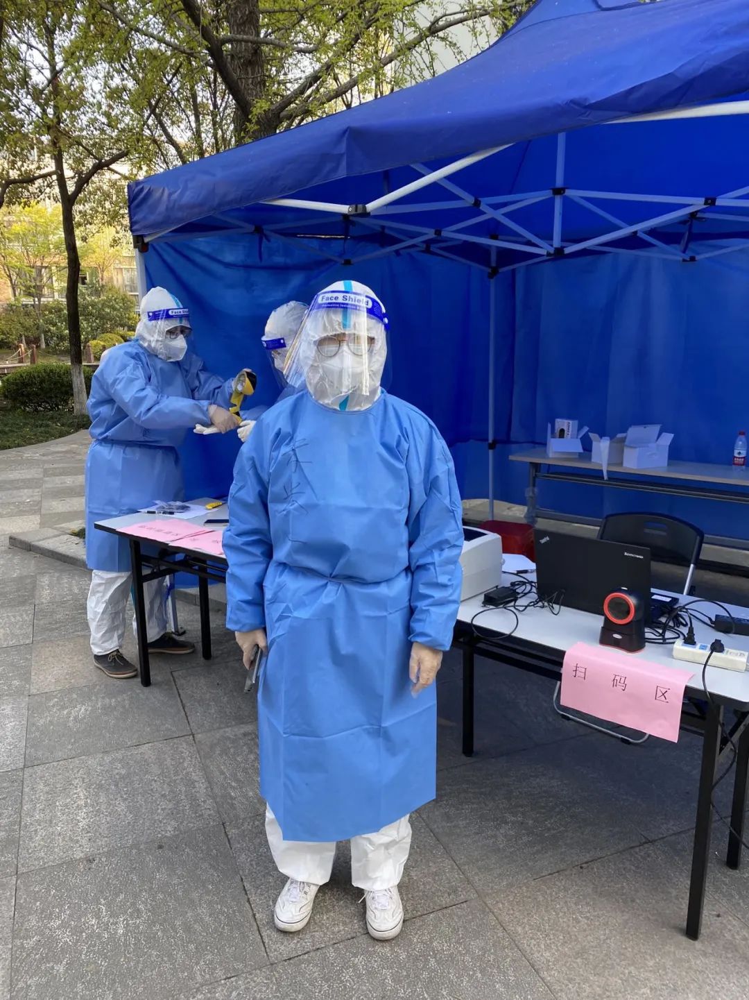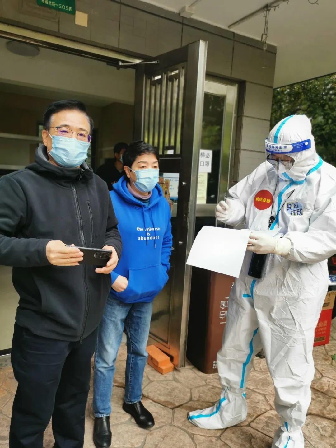我的任务是与章谦一起进行物资的运送,包括口罩、抗原检测盒等。穿上大白,坐上汽车,辗转楼宇之间,飞驰阡陌之上,到了日伏星出、饭菜微凉之时,我们才把1500个口罩全部送完。天气比较热,防护服很闷,我们全身都被汗湿透了。我的情况则更乌龙,在连着打了十几通电话后,电信因“使用情况异常”为由,把我的手机卡冻结了,几天也没申诉成功,后面出任务时只能借他的手机来联系宿舍楼负责人。
