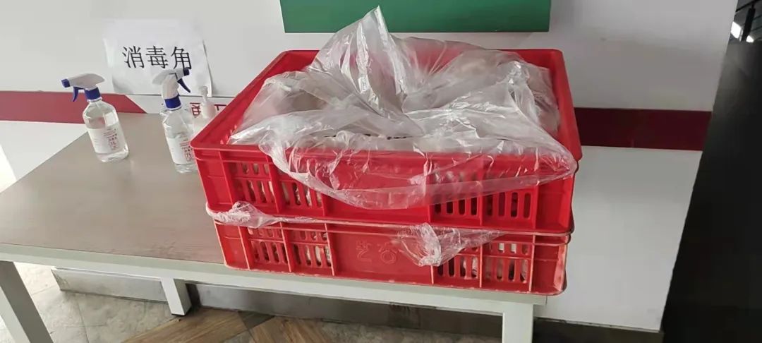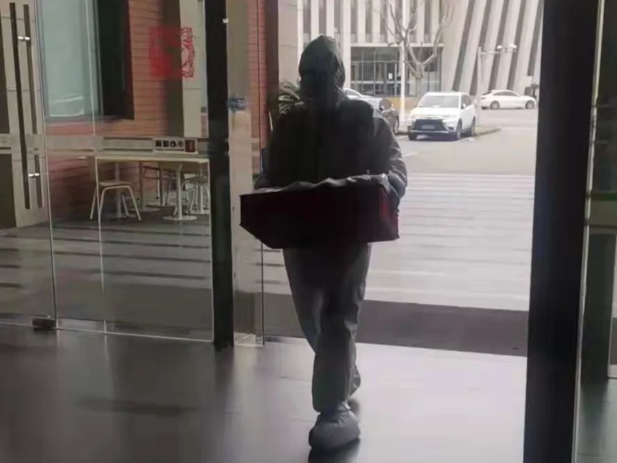 (员工志愿者给楼内同学送饭)