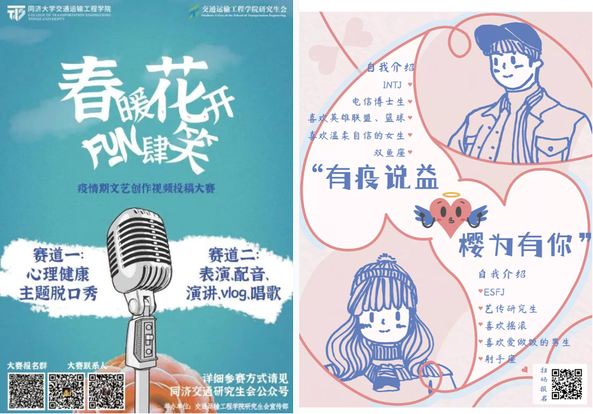 娱乐活动也一个都不能少!研究生会、员工会还举办了创作视频大赛“春暖花开,FUN肆笑”,玩转脱口秀尽情展现才华,还有面向全校的交友活动“有疫说益,樱为有你”,以及宿舍楼内同学们自发组织的“跟唱大赛”……什么都封不住我们交通学子的才华,充满希望才能更加乐观地抗击疫情!