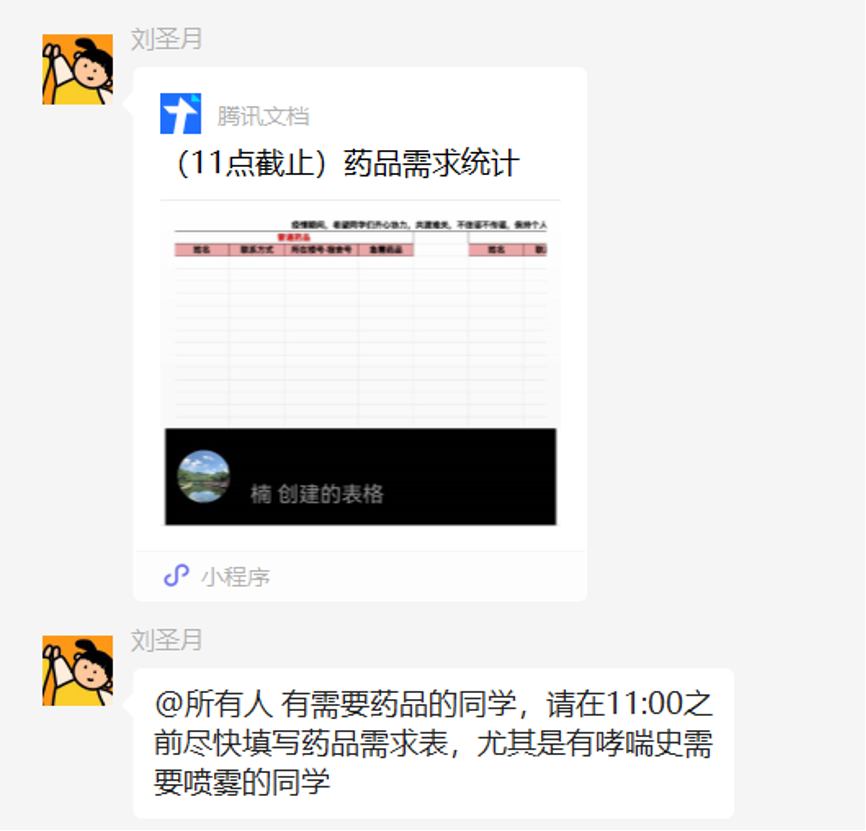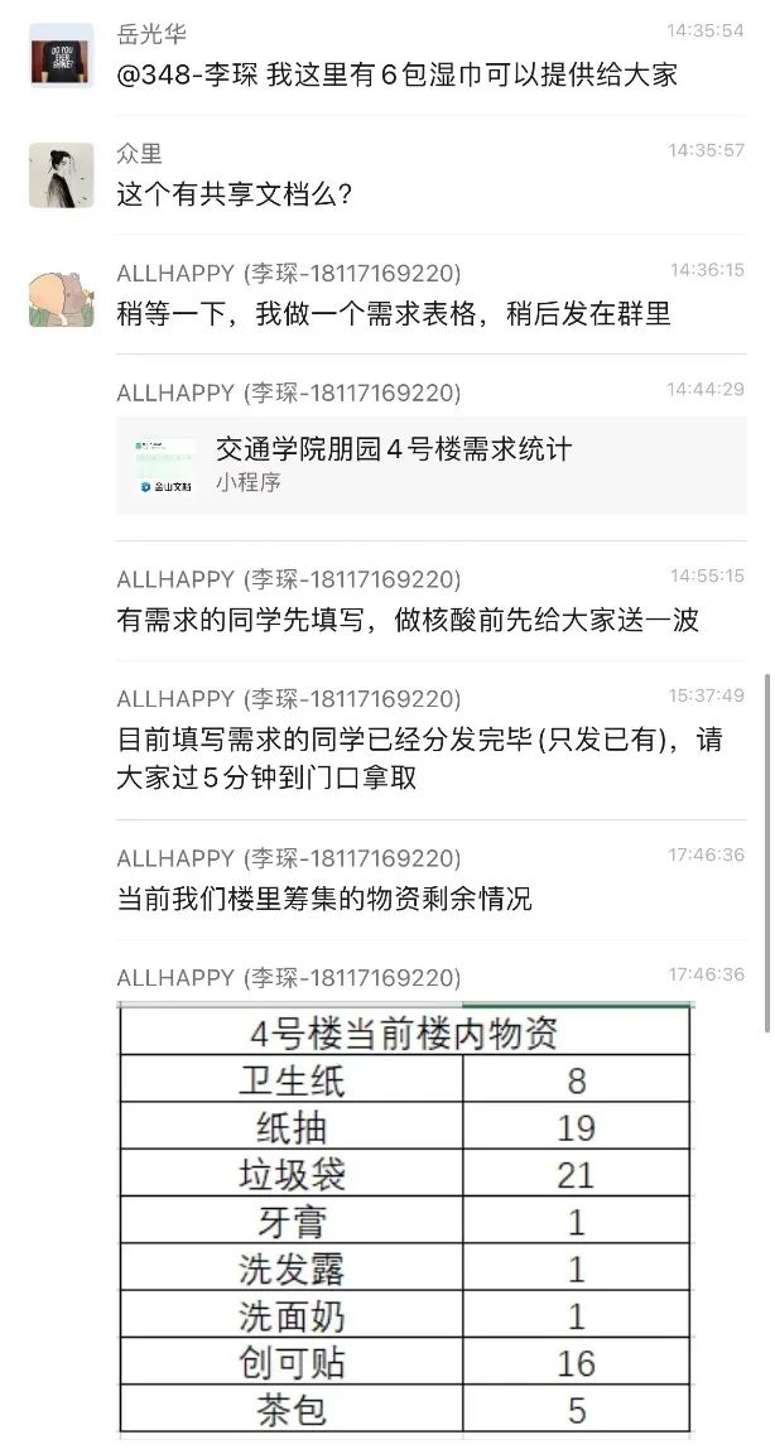 校内全部楼宇进入闭环管理后,各楼物资资源紧张,部分同学宿舍储备不足。yl8cc永利员工率先发起物资互助文档,以在线共享文档形式发布自己可提供物资、紧缺物资信息,同路人的使命担当惠及全校师生。