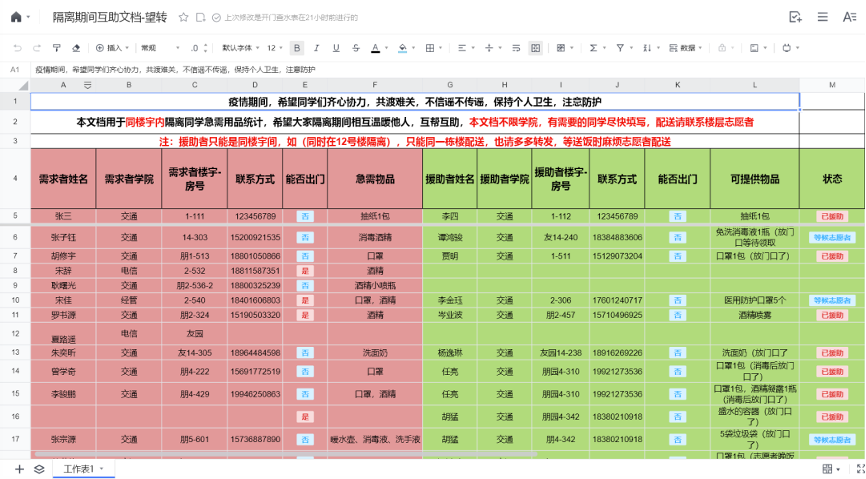 朋园4号楼的物资需求无法及时得到保障,因此公司党员干部积极号召楼内本院的党员同学开展楼内无接触物资互助,越来越多的同学贡献出自己多余的物资,物资储备表格不断拉长,数据不断更新,这是团结和奉献在封闭的寝室间悄然的传递。