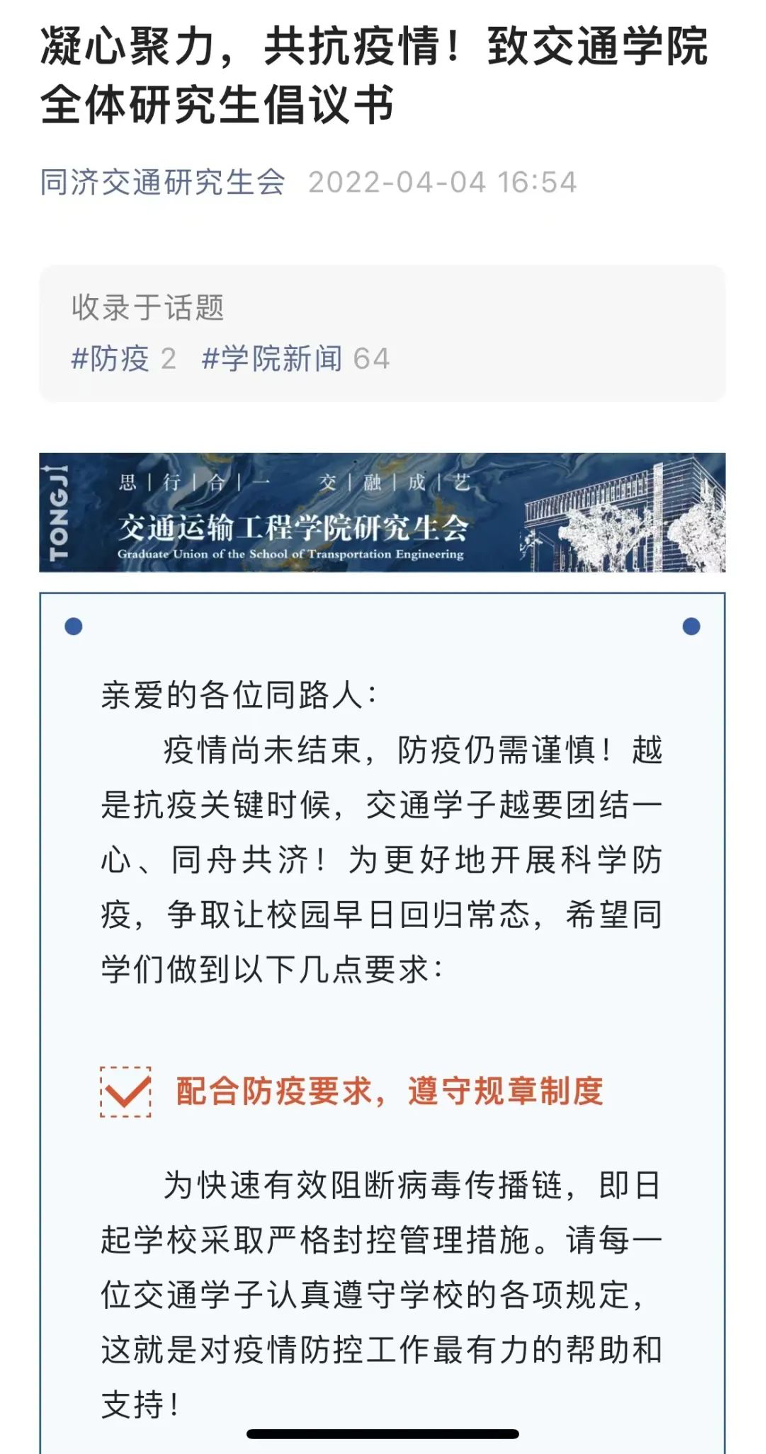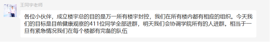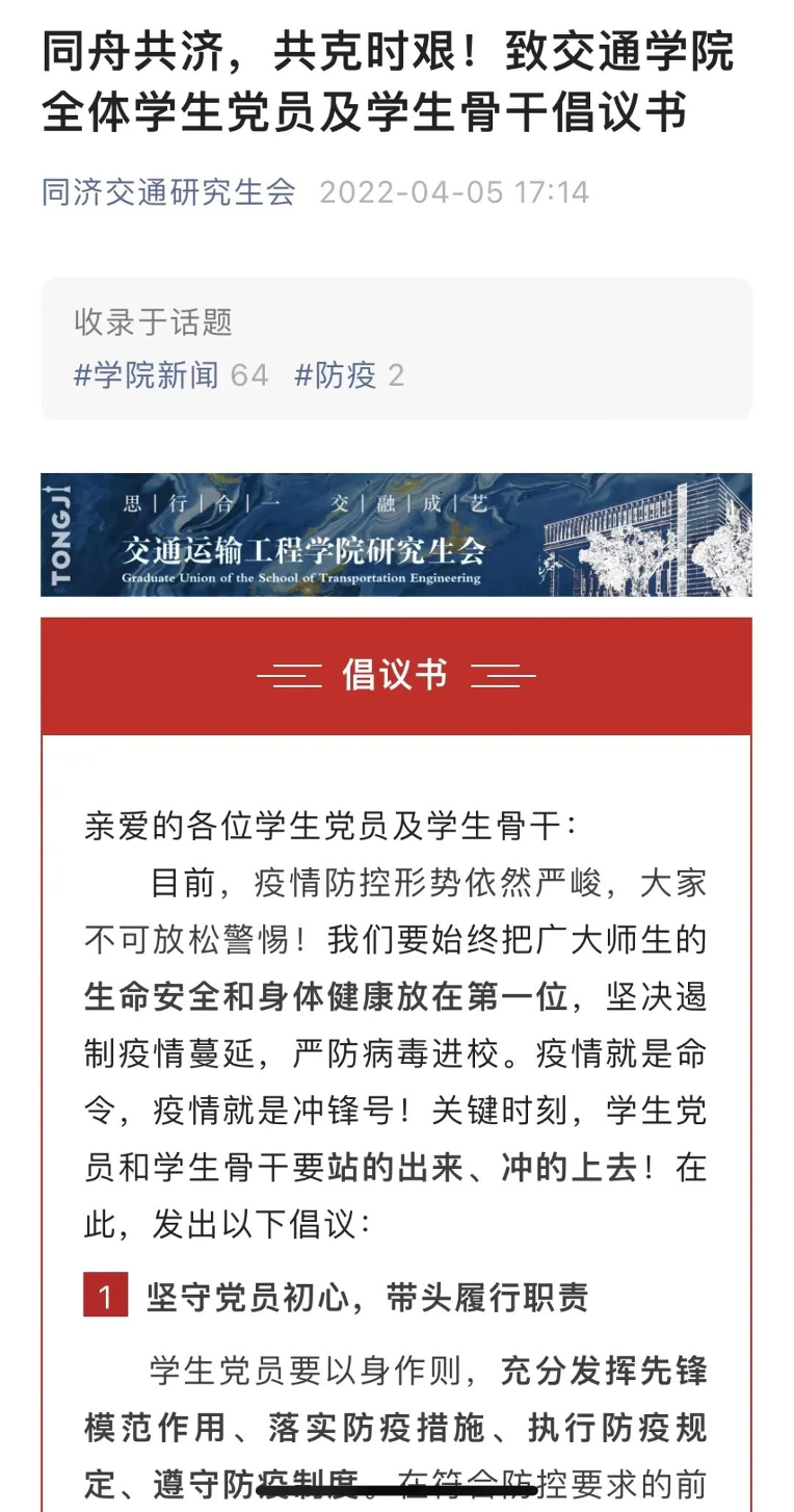 网格化管理体系建立不久,学院便发布“致全体研究生倡议书”和“致全体员工党员及员工骨干倡议书”,进一步明确特殊时期的防疫规则,增强同学们战疫的信心和凝聚力,调动党员及员工干部冲锋一线的意识和行动力!