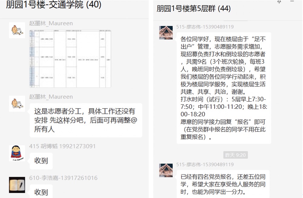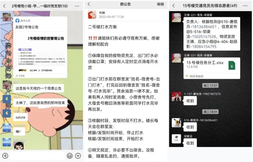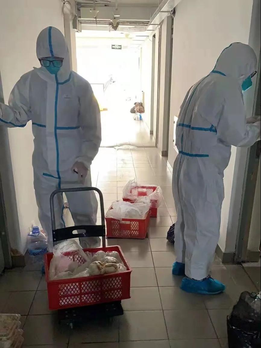 友园12号楼作为嘉定校区最早封控管理楼宇,目前为止已经封控管理6天,在此期间,交通运输工程学院友园12号楼临时党支部涌现出一大批优秀党员同志,临危受命,在楼内担任层长、志愿者等一系列重要岗位,不辞辛苦、不计其数的上下楼搬运餐食、饮用水等生活必需品。