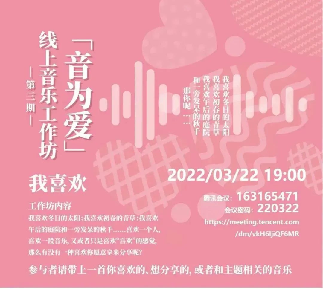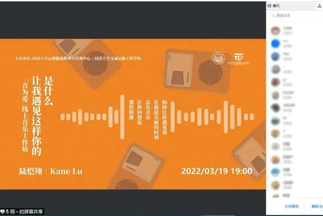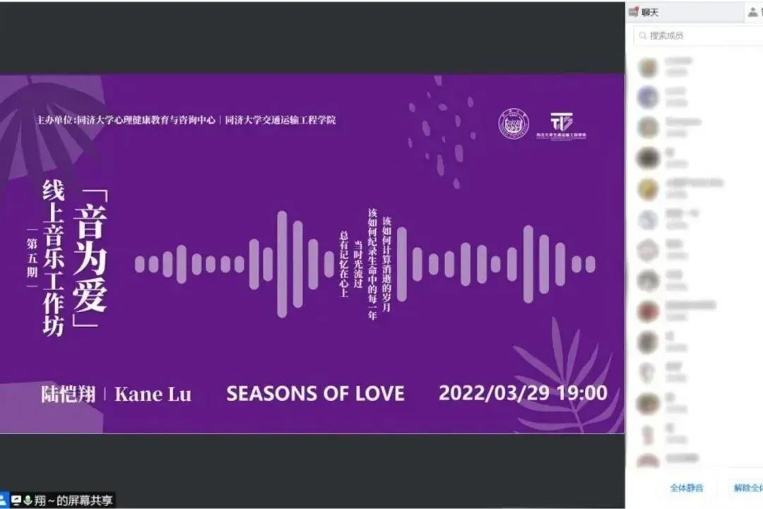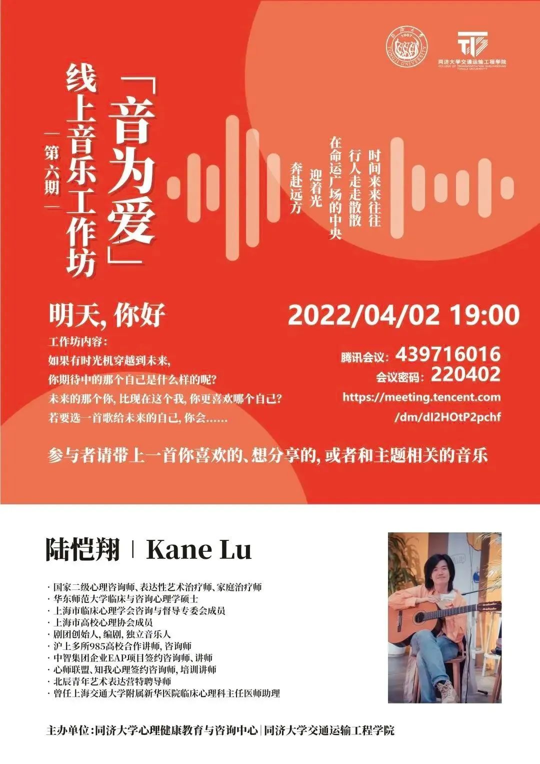 3月15日至4月2日期间的每周二、六19:00,由学校心理健康教育与咨询中心和交通运输工程学院联合主办的“音为爱”线上音乐工作坊以六期不同的主题与全校师生持续见面。该活动由国家二级心理咨询师、表达性艺术治疗师、家庭治疗师陆恺翔担任主讲嘉宾,旨在从音乐切入,伴随故事交流分享与心理学的相关探讨,缓解师生在准封闭管理期间的焦虑情绪。