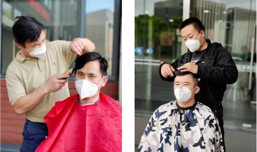 这些留守在通达馆的老师们,生活更为不便,睡觉只能打地铺或者是行军床,洗漱只能依靠洗漱间简单的擦拭。即便如此,在完成学校的多项志愿工作之外,一些老师也趁此机会,各显身手,展露不一样的风采技能。肖飞鹏教授和王同宇老师在闲暇之余化身托尼老师给留守在学院的教职工还有后勤人员理发,大家在通达馆内守望相助,携手同行。后续还有更多的老师积极响应,排除家庭困难,进一步做好校内服务人员的补充工作。