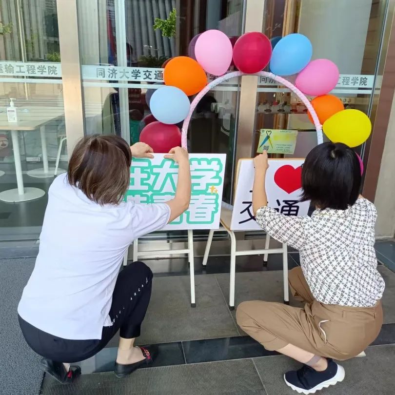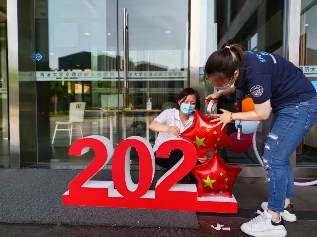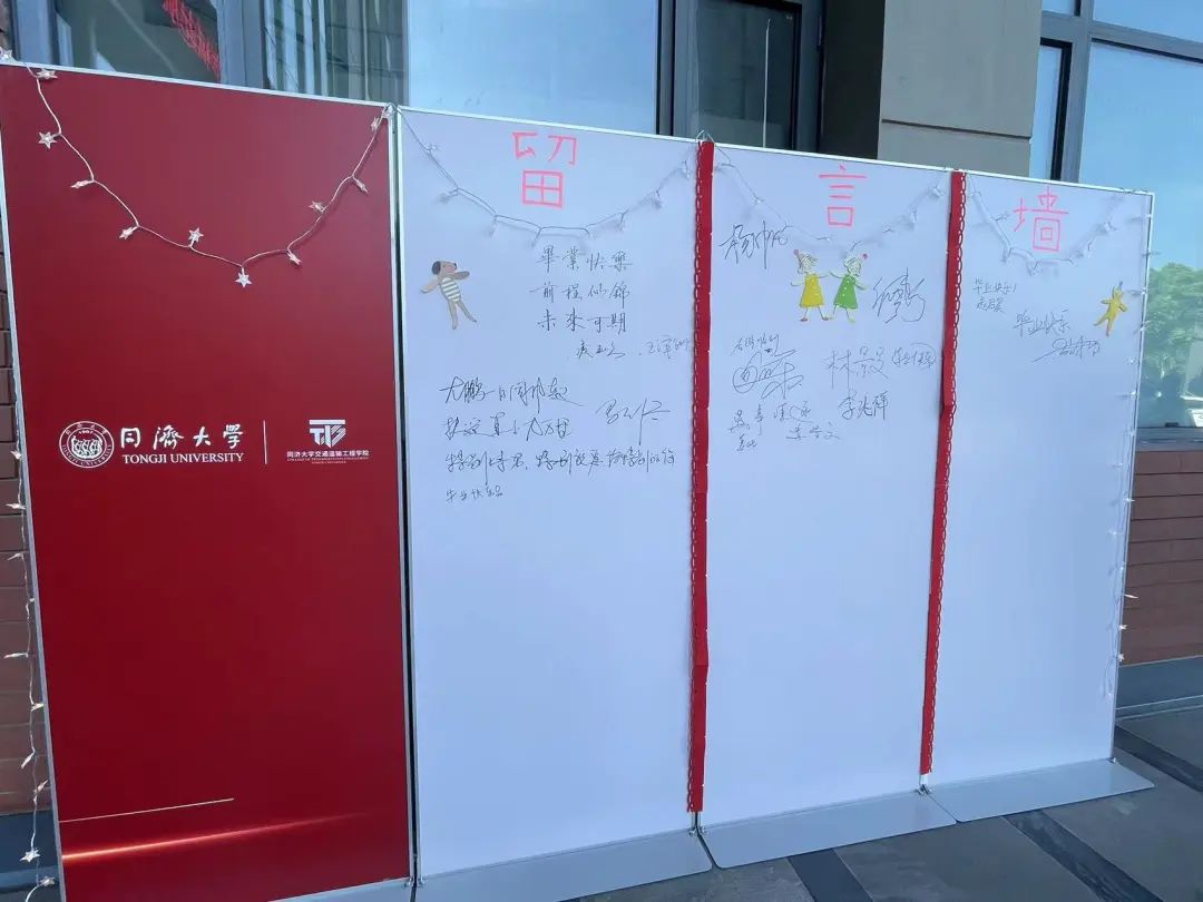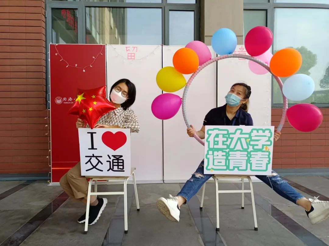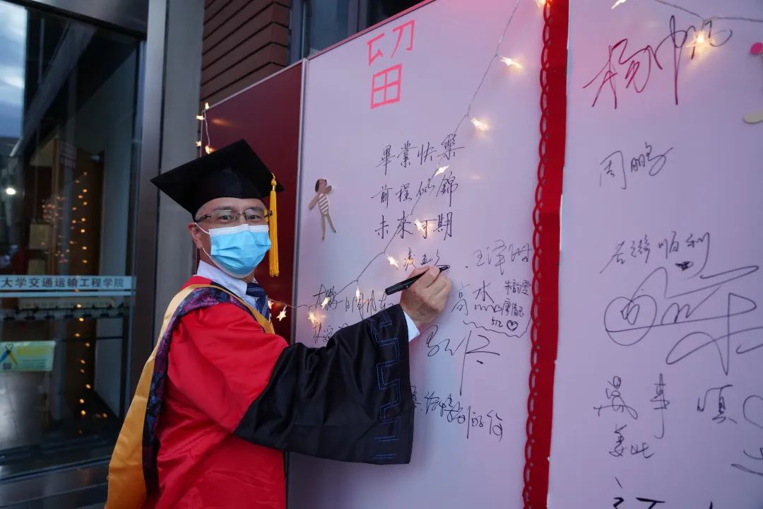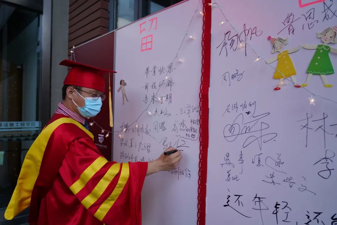 不仅如此,疫情防控之下,学校及学院都无法开展大规模的毕业庆祝活动,为了让毕业班的同学不留遗憾,学院在校教师们利用现存物资创意制作,用心改造布置通达馆大楼门口,给毕业班同学设计合影布景,尽可能地让同学们能够拥有毕业纪念照片。凌建明经理、马万经书记等也在纪念板上签字留言,寄语同学。同时在每晚的动态网格活动时,学院在校教师们也在通达馆的交叉口布置了精美的气球和灯光,给路过的同学们打造温暖的校园回忆。这些暖心的布置和用心设计,给疫情防控下的校园增添了许多美好的色彩,更让毕业班的同学们感受到了学院浓浓的关怀。