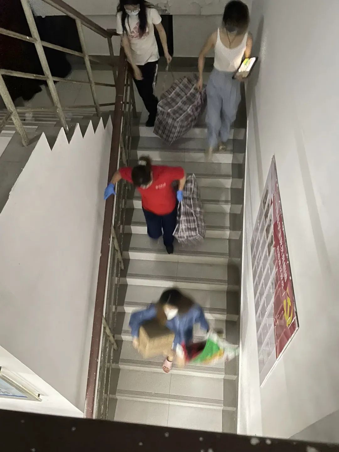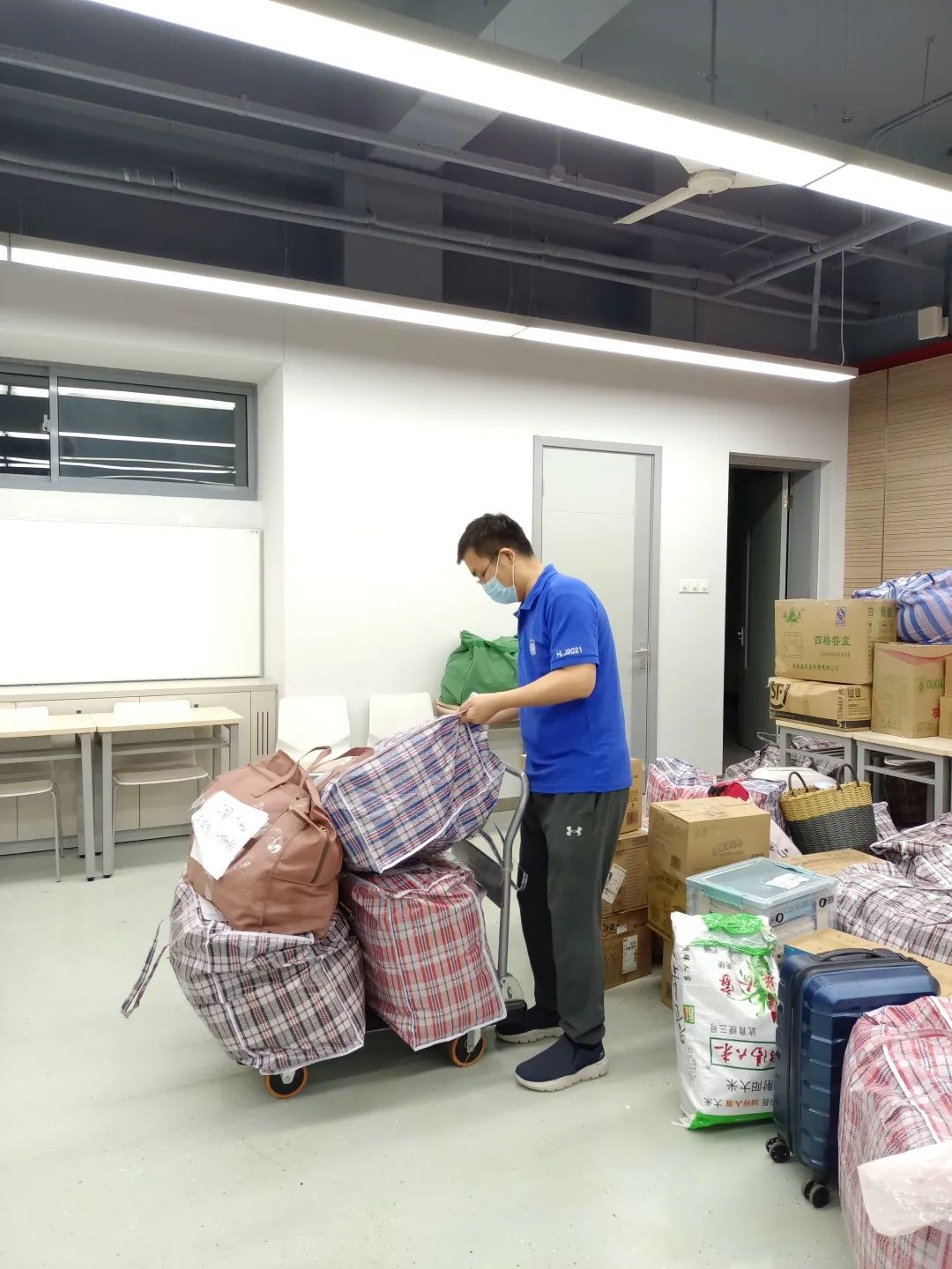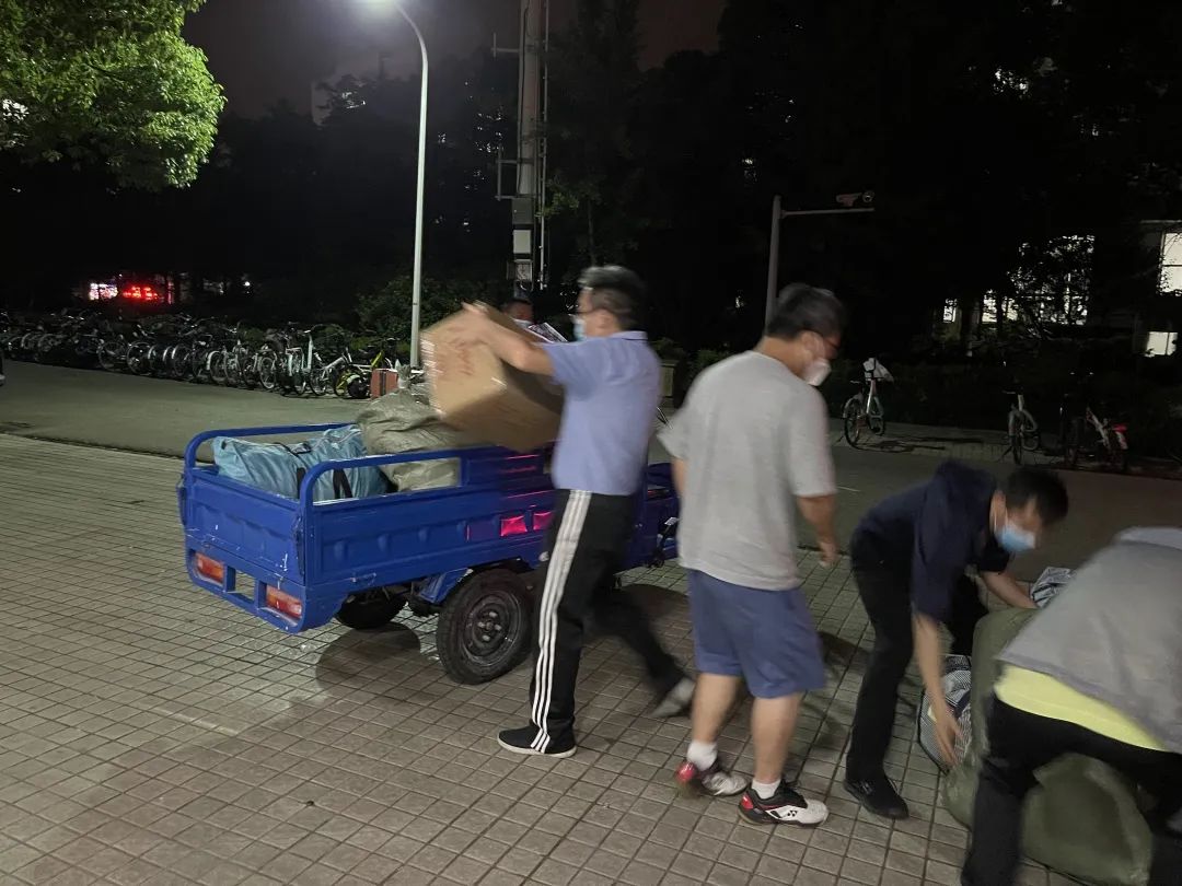 由于友园9-10号楼暑期将进行修缮工作,员工宿舍需要整体清空,居住在友园9-10号楼的女同学们需要将行李打包,部分需要寄存在教学楼的集中安置区,部分需要安排快递运出。但在疫情防控之下,宿舍楼无法随意进出,考虑到9-10号楼是女生宿舍楼,行李多且运力弱的特殊情况,交通运输工程学院的老师们自发组成搬运队,马万经书记、黄灿彬副书记带队,各位老师分工协作,保障友园9-10号楼以及其他毕业班同学的行李搬运工作。即使夜深了,老师们依然频繁上下楼梯,大包小包地运送员工们的行李,并一件一件地归置在教室内,用实际行动给交通学子提供贴心守护。