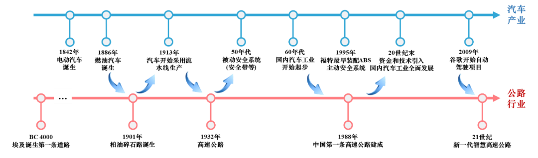 上个世纪中期世界第一台电动汽车诞生,标志了车辆作为新型交通工具迈入历史舞台。在随后的一百余年,1886年燃油汽车诞生、1901年柏油碎石路的推广、1932年世界第一条高速公路的建成、1988年我国第一条高速公路建成,标志着汽车工业逐步向平民化、快速化、信息化发展。