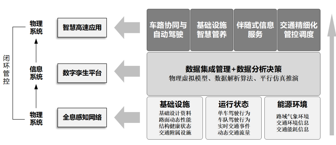 2.1新一代智慧高速的逻辑架构:核心在于依托全息感知网络和数字孪生平台实现智慧高速物理系统和信息系统的闭环、一体化协同管控。