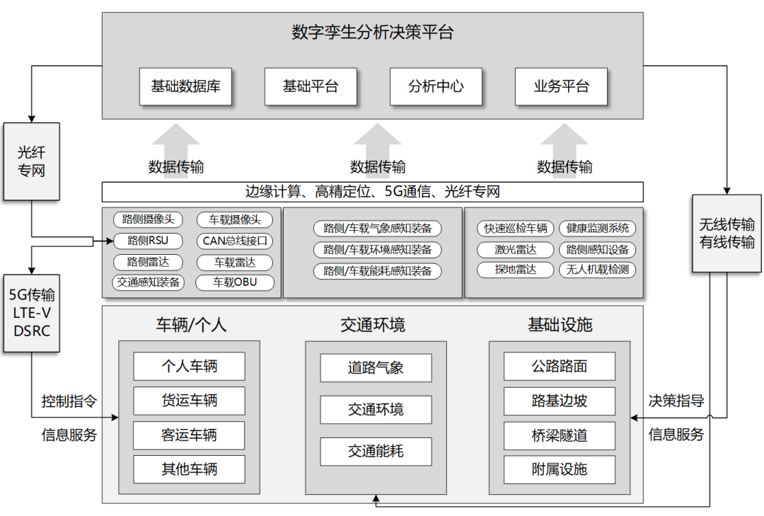 信息传输网络是连通整体物理架构的纽带,其包括底层感知网络与数字孪生平台直接的数据上传,以及应用系统中的数据应用。同时,基于5G等高带宽、强切片能力的通讯网络也赋予了系统强大的算力,搭建云边融合的数据分析与发布体系,满足车路协同对于数据的鲜度需求。