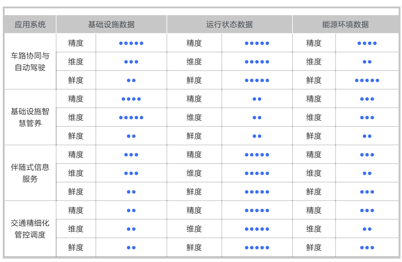 数据的物理属性是决定现阶段智慧高速技术架构和智慧高速未来发展途径的重要因素。数据精度明确了感知设备和定位设备的技术要求、布设方式、数据解析要求;数据维度明确了感知设备的选型、数据融合方式和知识拾取技术;数据鲜度则直接约束了通讯网络信息交互模式,包括设备选型、传输模式、组网形式。不同的智慧高速应用场景对各类数据资源的物理属性要求不同。