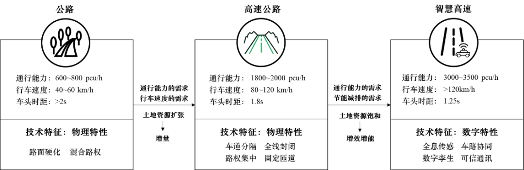 用户需求是带动公路系统技术形态升级的根本动力,公路系统的技术形态升级从物理与数字特性出发,主要可以分为三个阶段:普通公路阶段、高速公路阶段,以及智慧高速阶段。20世纪初,燃油车的快速发展需求推动了公路路面由碎石路升级为硬化路面。在该阶段,通过路面硬化和路幅拓宽使得普通公路单车道的通行能力提升至600-800 pcu/h,行驶速度可达40-60 km/h,但路权特性还尚未明确划分,多数公路仍以多种交通方式混合为代表。