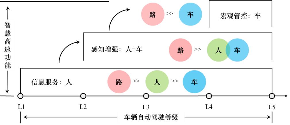 新一代智慧高速的系统内涵主要面向使用者与管理者两个维度。对于使用者而言,其服务功能随着自动驾驶等级也会有所差异。对于L2级自动化及以下的人工主导的驾驶车辆,智慧高速主要为其提供可靠的信息服务支持,例如自由流收费、恶劣天气的安全预警、路径与速度诱导等;对于L3-L4级半自动驾驶车辆,智慧高速主要为其提供感知增强或感知冗余功能,从而保障车辆的行驶安全与效率;对于L5级的全自动驾驶车辆,智慧高速主要从宏观调度角度协同控制车队行驶,保障车辆在低时距、高速度下的行驶稳定性与可靠性。
