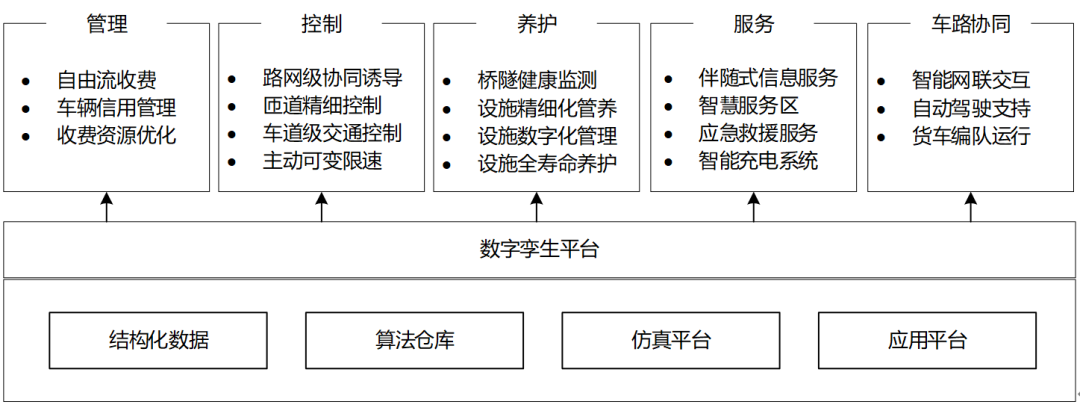 例如,面向交通管理部门时,管理部门可接入实时的路网流量信息和车辆ETC信息,实现自由流收费、车辆信用管理、收费资源优化等功能;面向路政管养时,管养部门通过接入动态的基础设施性能状态数据,结合原始设计资料,有效服务于设施的精细化、全寿命管养,实现基础设施的闭环管理;面向个人驾驶用户时,个人行驶车辆可接入实时的交通状态、设施状态、气象状态信息,结合车辆本身的各类状态参数,实现伴随式信息服务、智能充电、服务区智能诱导等功能。