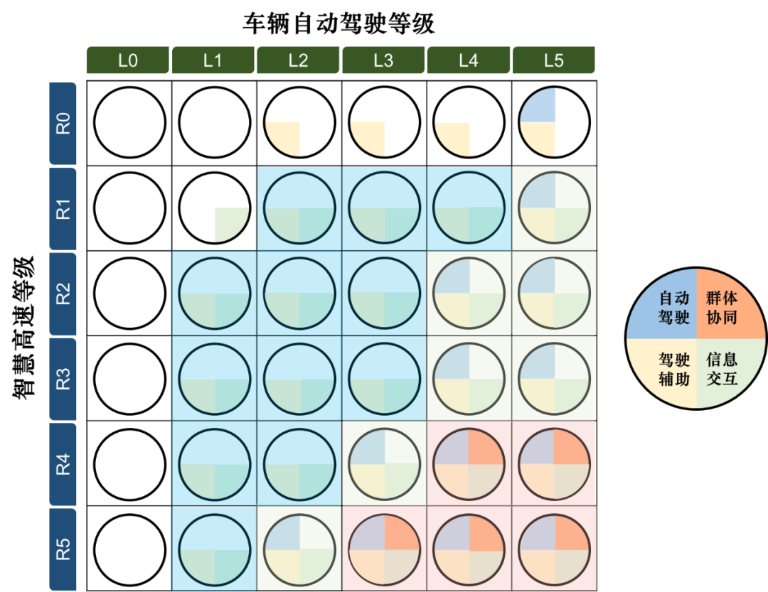 图8中相同颜色背景代表基本具有相似的能力。例如L4等级的车辆与R5等级的道路组合,可以实现L5等级的车辆与R3等级的道路组合相同的群体协同效果。在实现同一功能应用下,更高智能等级车路的功能更稳定,但同时成本也更高。充分结合车路能级组合,采用车路耦合发展路径,更适应于面向大众的商业推广。