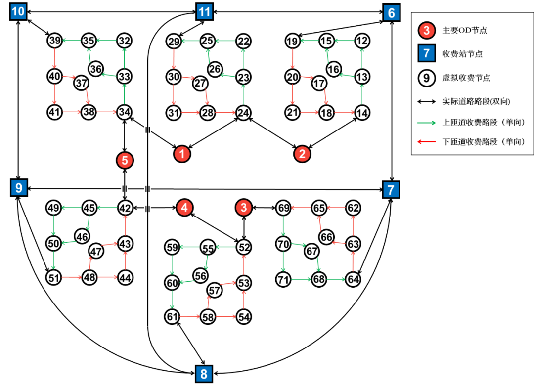 图5为实例的网络拓扑结构。在等价的拓扑结构中,蓝色节点代表收费车道与实际道路的连接处,分别代表6个收费站,红色位置为用户OD矩阵的虚拟中心。绿色与红色箭头代表单向收费路段,黑色路段为实际道路,均为双向道路。经转化后路网变为含有71个节点,共120个路段。