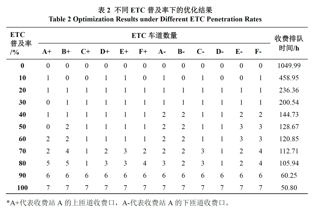 设置从0%至100%的ETC普及率,对六个收费站的ETC车道数量进行优化,优化结果如表2所示。为保障MTC车辆的通行权,如ETC普及率低于100%,各收费站至少设置一个MTC车道。随着ETC普及率的提升,各收费站的ETC车道数量一般随之上升,带来收费排队时间的下降。当ETC普及率从20%增加到30%,A区进口ETC车道减少一条。其原因在于,区域2有A和F两个上下高速公路的收费站,减少A收费站的ETC车道可驱动ETC车辆至F收费站,F收费站的ETC收费车道数量足够满足ETC车辆需求,增加A收费站的MTC车道可降低MTC车辆的通行排队时间。