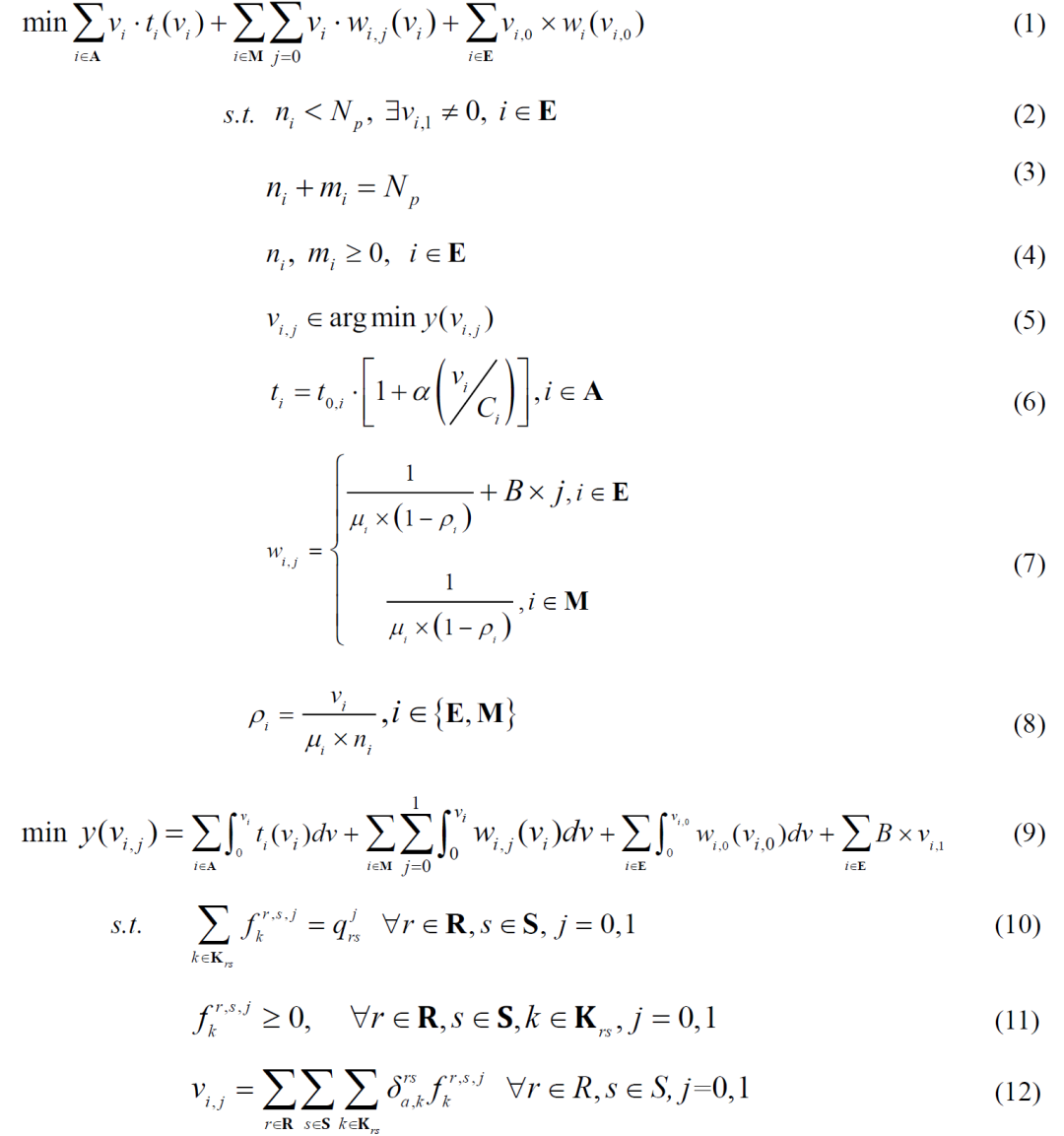 面向混合收费站的路网用户均衡模型(User Equilibrium, UE)可表示为式(9)-(12),其描述了路网层面混合收费站不同的收费车道布设方案,ETC和MTC车辆的路径选择以及ETC车辆的收费车道选择。式(9)为多用户均衡的目标函数;式(10)表示每类车辆在路径上的流量和等于给定的交通需求;式(11)保证了流量的非负性;式(2)表示路径流量与路段流量的关系。