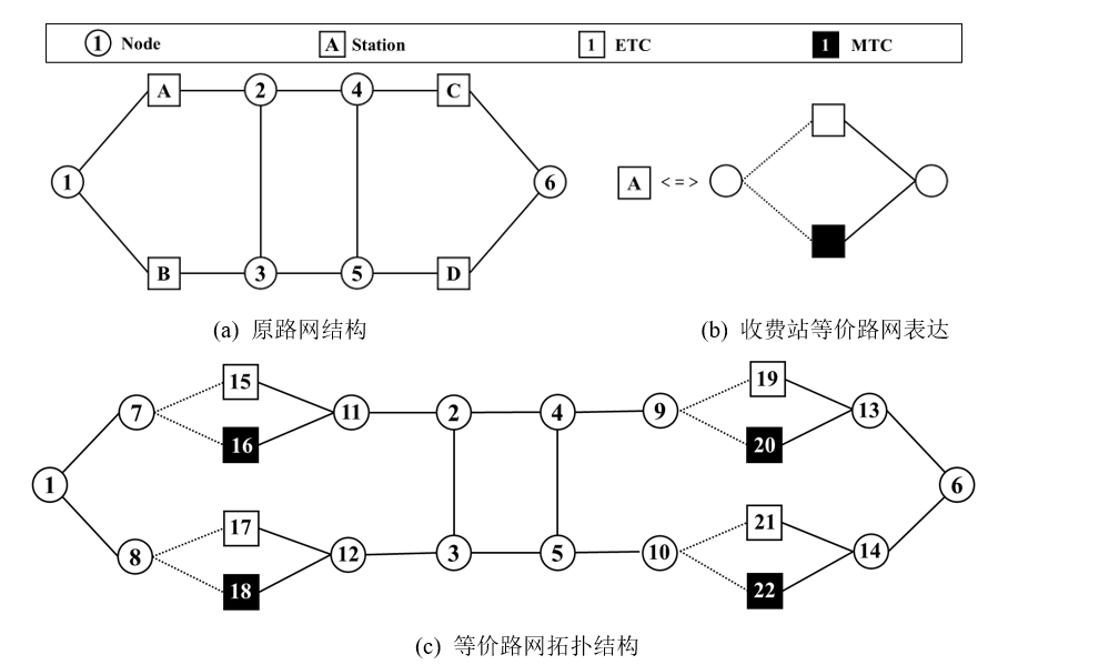 综上所述,现有ETC车道布设优化研究主要针对单收费站,或在路网层面考虑仅有ETC车道的场景,缺少路网层面混合收费站的车道布设分析和优化。不同类型车辆在不同收费车道的通行权差异会直接影响用户的路径选择与路网流量分配。