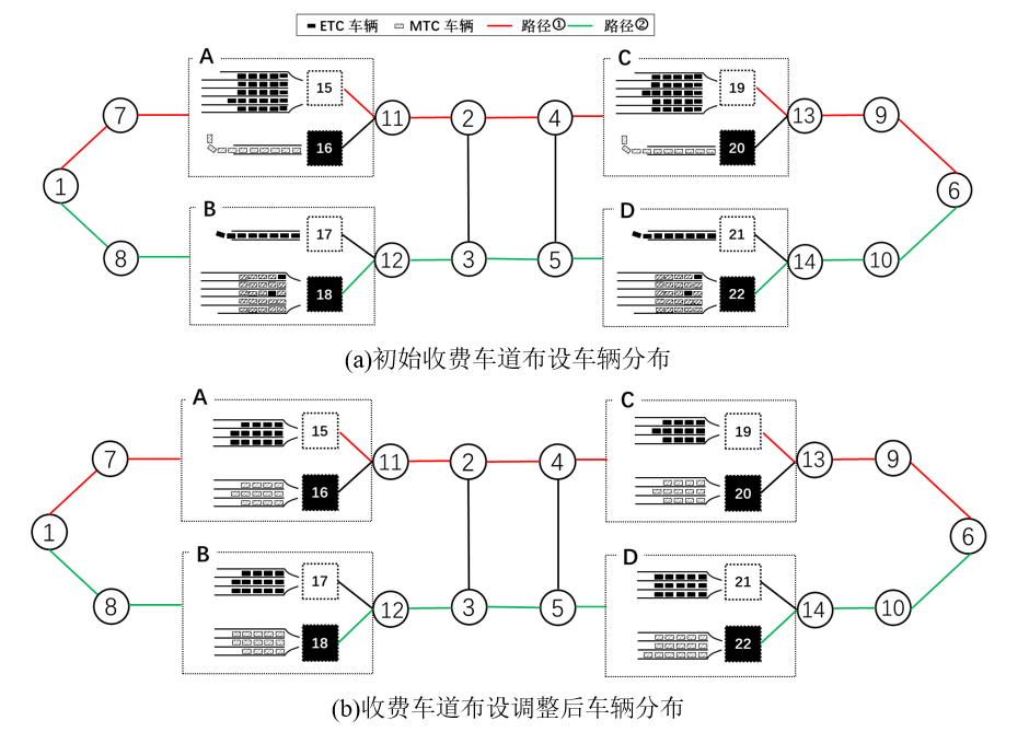 收费车道布设问题可表征为管理人员与用户的博弈过程。公路管理者通过调整收费车道的布设,影响车辆的出行选择;车辆的出行选择会影响路网和收费站的通行效率,从而影响管理者的决策,如图2所示。图2(a)表示初始收费车道布设条件下车辆的分布情况,收费站A和C有5条ETC车道和1条MTC车道,B和D站有1条ETC车道和5条MTC车道。大多数ETC用户会选择路径①,利用ETC车道快速通行;而大多数MTC车辆会选择路径②,以避免收费站A与C过长的收费排队。选择收费站B的ETC车辆甚至可能转移到MTC车道行驶。图2(b)为调整后的方案,部分MTC车道在收费站B转换为ETC车道,同时部分ETC车道在收费站A转换为MTC车道。方案调整后,部分的MTC车辆会转移到路径①,且部分的ETC车辆会转移到路径②。