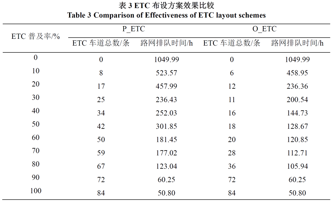 表3比较了本文提出的ETC车道优化布设法与比例布设法的结果。其中P_ETC依照各收费站ETC车辆比例配置ETC车道数量。O_ETC代表本文提出的双层模型优化结果。由于未考虑不同收费站之间的交互影响,比例布设法可能导致部分收费站MTC车道拥堵,产生较高的收费排队时间。而本文提出的O_ETC方法则根据路网的OD与设施情况调整ETC车道的路网分布情况,在保证通行效率的同时,降低ETC的改造数量与成本。相比于P_ETC布设,本文提出的优化方法可降低0.08%~57.37%的收费排队时间,通行效率提升效果显著,尤其在ETC普及过程中(10%~70%),O_ETC的优势可以充分发挥,如图6(b)所示。当ETC普及率从30%升至50%,比例布设法可能导致收费排队时间增加。其原因在于,过多的ETC车道压缩了MTC车道数量,导致MTC车道的排队时间加长。当ETC普及率超过90%时,两种布设方案取得的效果基本一致。