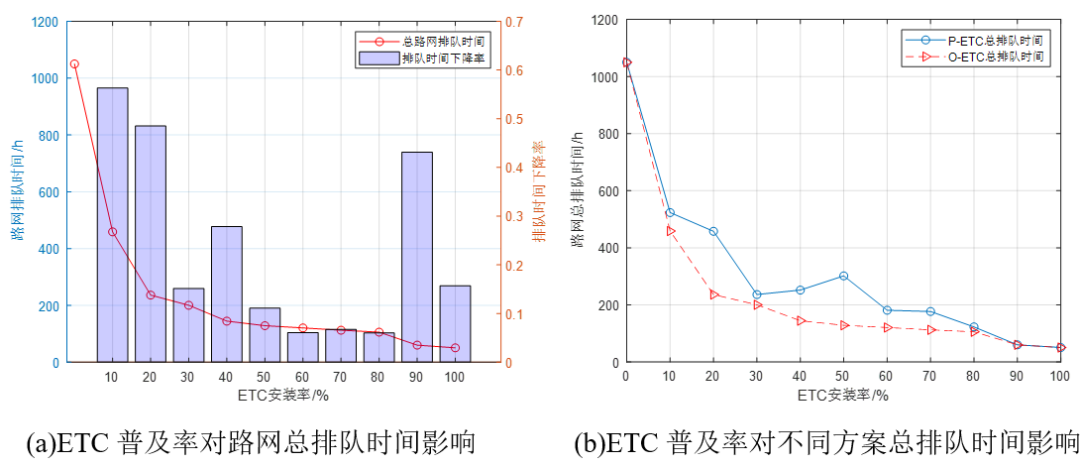 当ETC普及率从0%提高至100%,收费排队时间呈负指数下降,共降低了95.16%。当ETC普及率较低时(≤20%),提升ETC普及率带来的效益明显,普及率提升10%,收费排队时间平均下降52.4%,少量的ETC车道即可发挥10%的ETC车辆的快速缴费优势,边际收益明显。当ETC普及率超过20%,其产生的排队时间下降率逐渐减小,提升ETC普及率10%平均降低收费排队时间12.15%,如图6(a)所示。当ETC普及率达到90%时,ETC车道数量明显上升,表明仅保留少数基本的MTC车道即可保证非ETC车辆的稳定通行,而充分发挥了ETC车道的通行效率优势。当ETC车辆的普及率达到100%时,则无需在各收费站设立MTC车道,从而实现了100%的ETC收费站应用率。