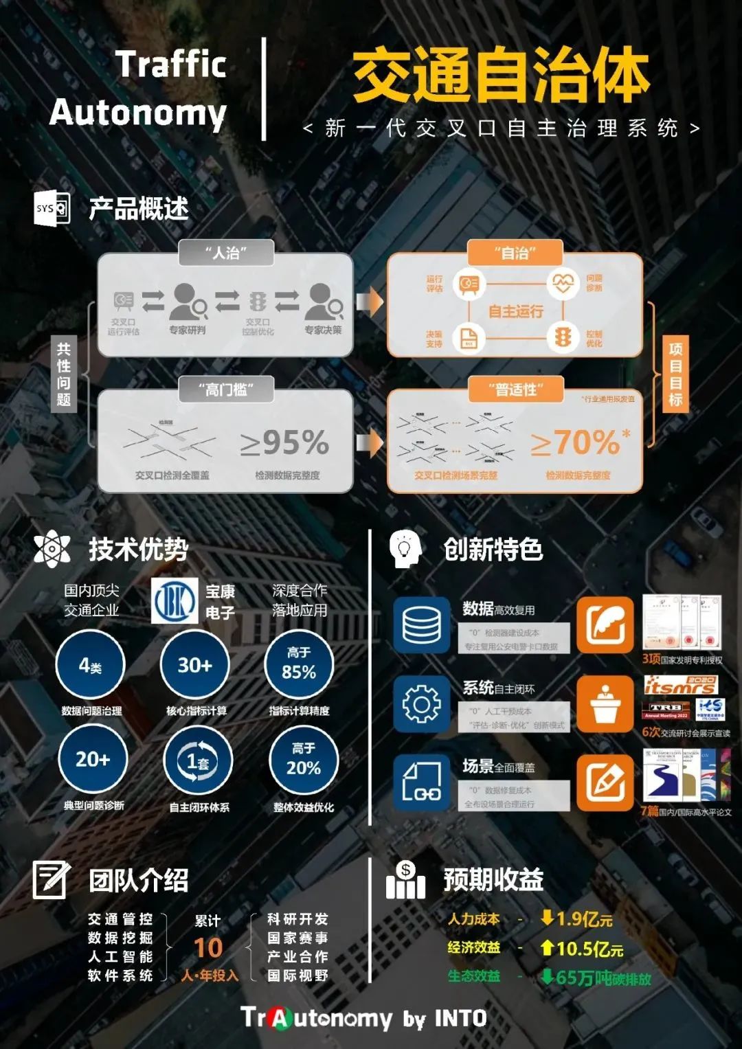 城市道路交叉口运行直接关系到居民出行质量,是智慧交通与智慧城市建设的重要抓手。城市道路交管市场亟需基于电子警察卡口数据开发一套交叉口全场景自主治理系统,实现从“人治”到“自治”、从“高门槛”到“普适性”的模式转变,支撑低成本、可持续的高质量城市交通治理工作。该参赛团队面向智慧城市精细化交通管控需求,结合交通流基本理论、先进人工智能算法、数据分析与挖掘、系统集成开发等理论和技术,并基于国内城市交叉口广泛布设的电子警察卡口设备,研发了“交通自治体(TrAutonomy):新一代交叉口自主治理系统”。该系统充分挖掘当前安防使用的电子警察卡口数据中蕴含的交通信息,构建了具有连贯性的“评估-诊断-优化-决策”自主闭环流程,包括5大关键模块、7大核心算法,适应于交叉口各种检测器布设条件,实现了全场景下城市交叉口交通运行的自动化精准管控。系统目前已在上海、常州等地进行了实证验证,测试结果表明交叉口整体优化幅度不低于20%。