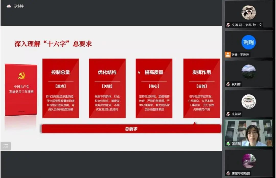 张志敏分别从“党员队伍大数据”和“发展党员工作大事记”两方面介绍了党内及学校的党员基本数据情况,梳理了历史上党员发展的脉络和情况,深入解读了党员发展工作中的“十六字”总要求:控制总量、优化结构、提高质量、发挥作用。同时,根据党员发展工作流程的五个阶段,从递交入党申请书到成为入党积极分子、发展对象、预备党员、正式党员,张志敏强调了对程序要求和时间要求等结合相关材料进行了详细解读。
