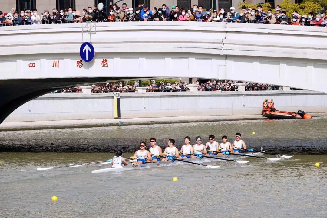 碧水粼波映秋阳,飞驰竞渡苏河浜。2022年10月29日至30日,2022年上海赛艇公开赛在上海母亲河苏州河上拉开帷幕。比赛设置了4.2公里追逐赛和500米城市冲刺赛,专业组、高校组和俱乐部组等累计40余支八人艇队伍参与。