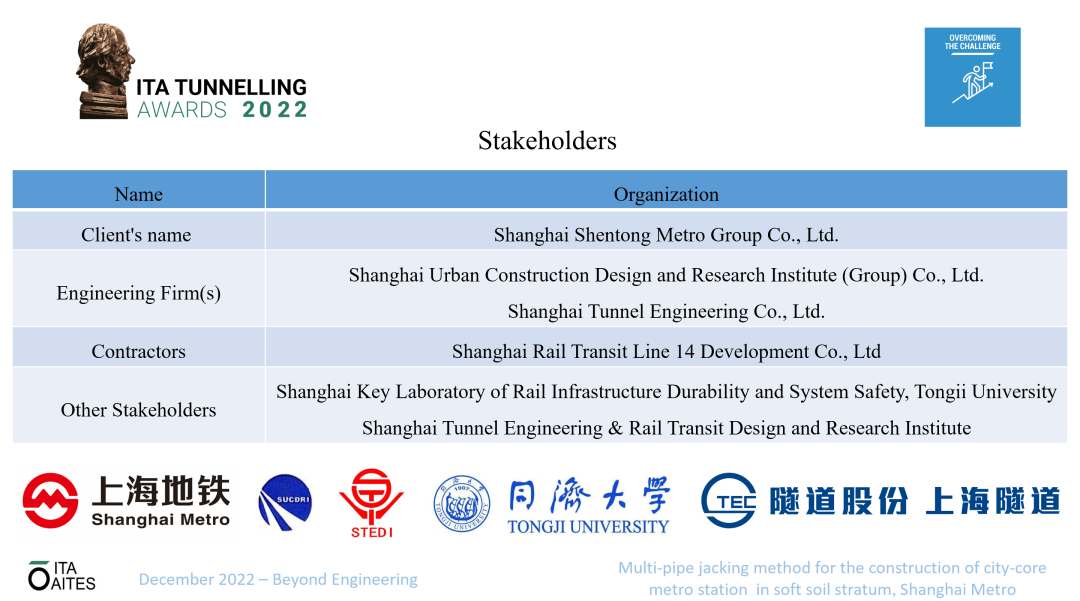 2022年12月08日,国际隧道与地下空间协会(ITA)颁布了第八届“ITA隧道奖”全球获奖名单。由公司上海市轨道交通结构耐久与系统安全重点实验室周顺华教授团队作为科技咨询单位,联合上海申通地铁集团有限公司(建设单位)、上海市城市建设设计研究总院(集团)有限公司(设计单位)、上海隧道工程有限公司(施工单位)、以及上海市隧道工程轨道交通设计研究院(审图单位)共同完成的“多顶管组合法修建地铁车站”项目,在全球诸多项目中脱颖而出,成功斩获年度唯一一项超越工程奖(Beyond Engineering)。