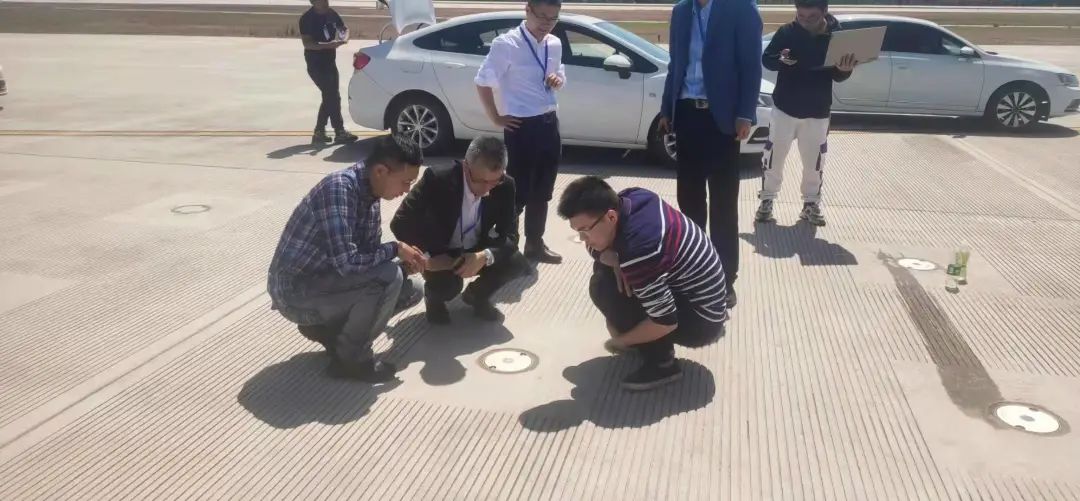 凌建明(左二)带领课题组骨干在成都天府国际机场智能跑道项目指导智能感知传感器安装和调试