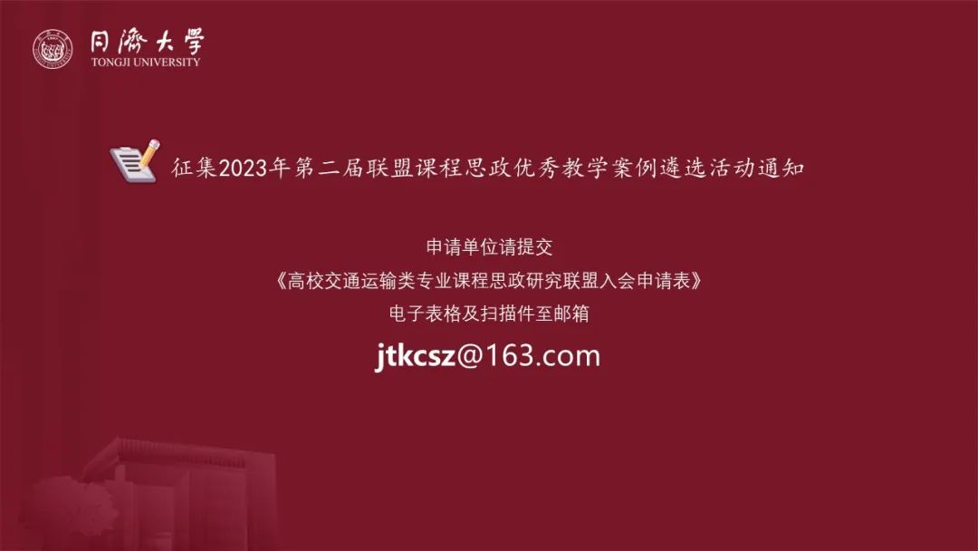征集2023年第二届联盟课程思政优秀教学案例遴选活动,申请单位请提交《高校交通运输类专业课程思政研究联盟入会申请表》电子表格及扫描件至邮箱:jtkcsz@163.com