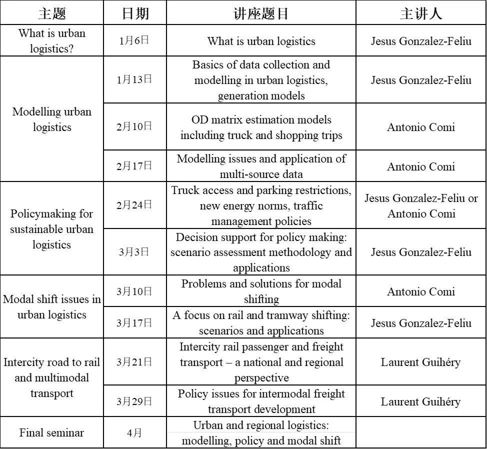 Jesus Gonzalez-Feliu教授长期致力于可持续城市物流的研究,是法国城市货运模型(FRETURB)的重要参与者,该模型已应用于巴黎等十余个欧洲城市。所提出的可持续城市物流体系、配送模式决策支持工具和城市货运需求预测模型等学术成果处于国际领先地位。已出版2本专著、发表论文260余篇,总被引用次数超过4000次,曾在10余个国际科学活动中受邀演讲,获第11届工业产品服务系统CIRP会议最佳论文奖。