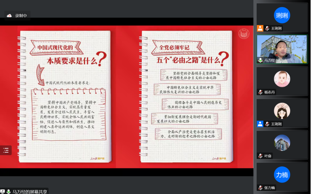 马万经带领教职工重温了党的二十大主题、中国共产党的中心任务、全面建成社会主义现代化强国的战略安排、前进道路上必须牢牢把握的重大原则、全面建设社会主义现代化国家的首要任务、立党为公、执政为民的本质要求、中国式现代化的本质要求、全党必须牢记的五个“必由之路”等关键词,通过相关关键词学习党的二十大报告主要内容。