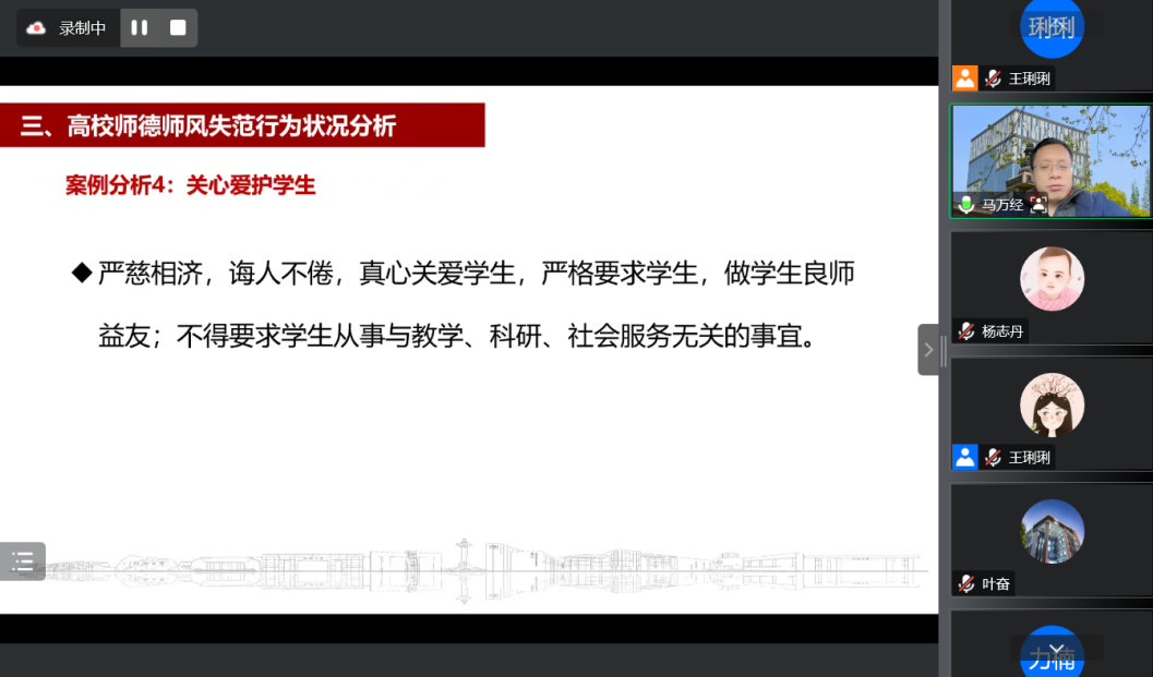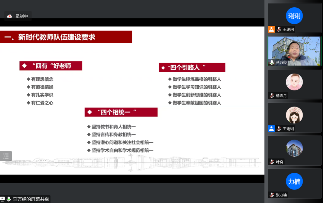 接着,马万经为全体教职工作师德师风警示教育,重温新时代教师队伍建设要求、新时代高校教师职业行为十项准则、关于高校教师师德失范行为处理的指导意见、研究生导师指导行为准则以及学校关于教师思想政治教育和师德师风建设的相关文件精神,重点学习了学校师德失范行为负面清单、风险点及相关案例。